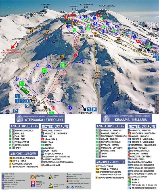 Парнассос Греция - это самый большой и хорошо организованный горнолыжный центр в стране. Отдых в Парнассосе ассоциируется именно с возможностью заняться горнолыжными видами спорта. Здесь расположены две высочайшие точки - Лиакура (Ликория )2.457 м и Герондоврахос 2.435 м. Между этими пиками, а так же в ущелье Арновриси действуют два известнейших горнолыжных центра- Фтеролака и Келария.