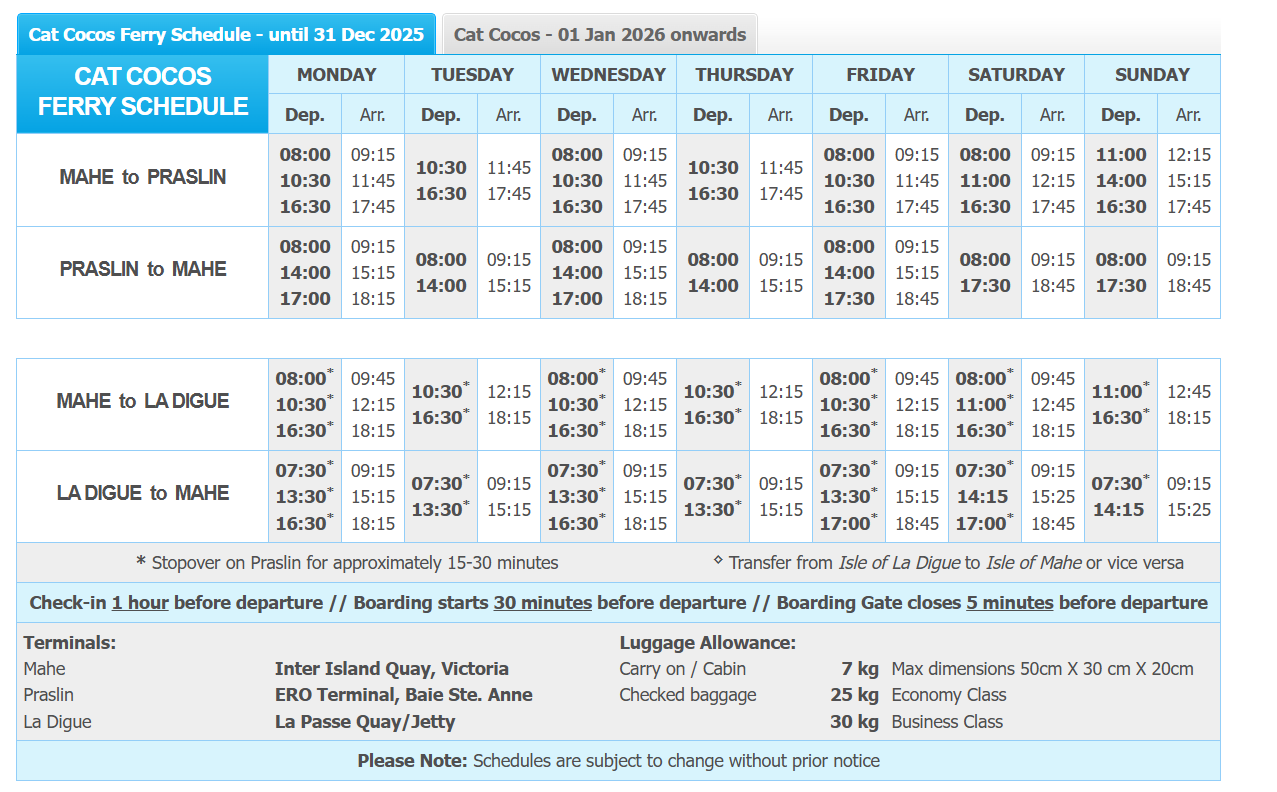 См. расписание паромов Маэ - Праслин, Маэ - Ла Диг и обратно, действительно до 31.12.2024.