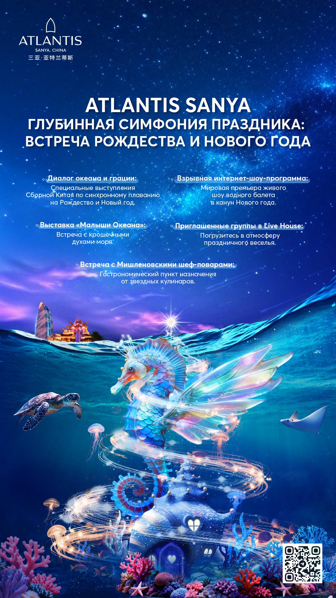 Праздничная программа представлена рождественскими ужинами, шоу синхронного плавания, мировой премьерой водного балета и тематическими сет-меню от шеф-поваров в Bread Street Kitchen & Bar и Ossiano. В Saffron предлагается рождественский гала-ужин-буфет, доступны торты-сашими на заказПослеобеденный рождественский чай, рождественские вечера «Синий океан» в Tikki Lounge.