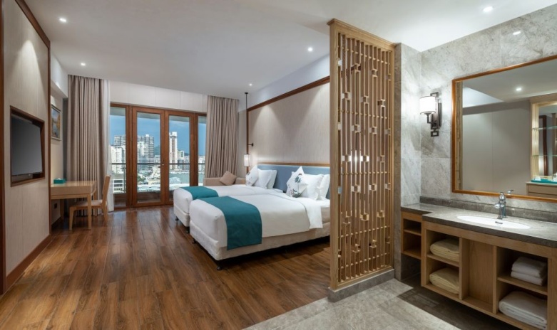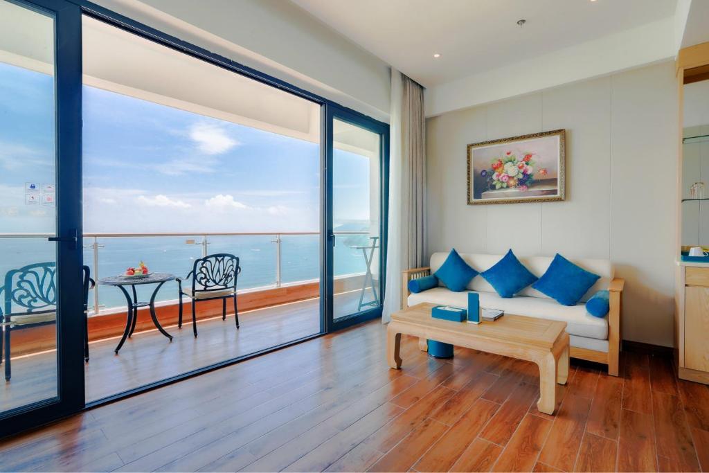 Номер расположен на 6-22 этажах, двуспальная кровать king-size или 2 односпальные кровати, зона ванной комнаты отделена ширмой, душевая кабина со стеклянной матовой перегородкой, гостевая зона, меблированный балкон, вид на море;