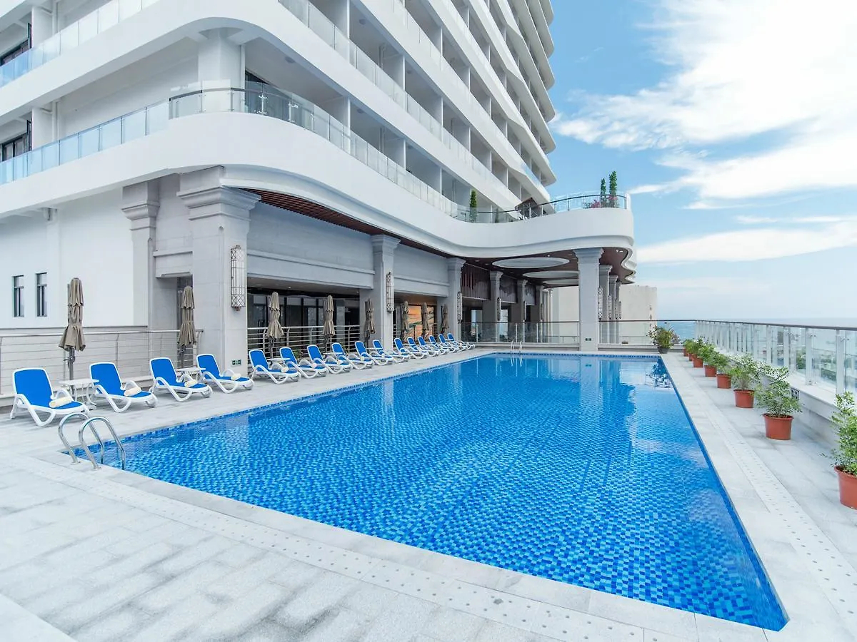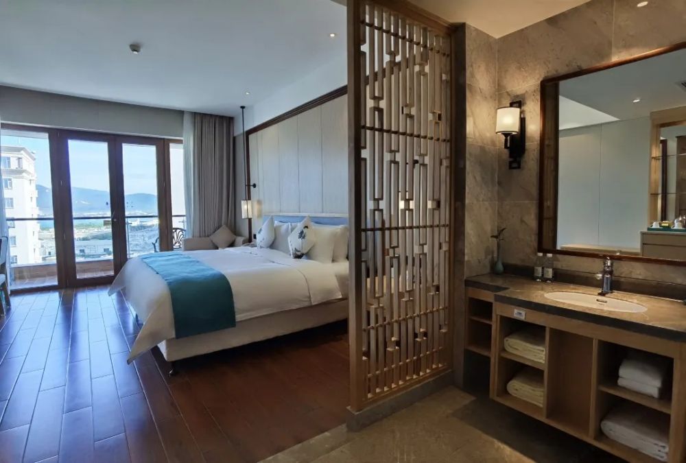 Номер расположен на 6-10 этажах, двуспальная кровать king-size или 2 односпальные кровати, зона ванной комнаты отделена ширмой, душевая кабина со стеклянной матовой перегородкой, гостевая зона, меблированный балкон, вид на город , на горы, на залив;