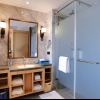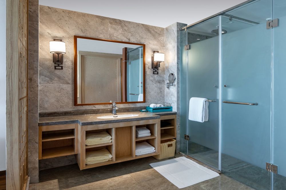 В номерах ванная комната открытой планировки отделена от жилого пространства небольшой ширмой, душевая кабина и туалет за матовой стеклянной перегородкой.