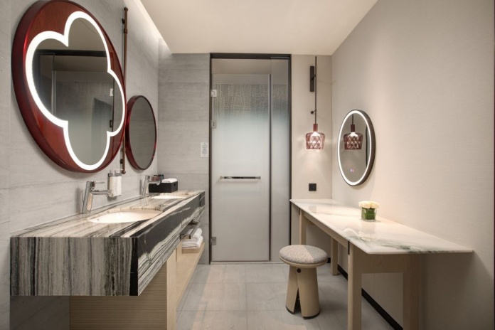* В части номеров и сьютов ванная комната с раковиной, ванной, душевой кабиной и туалетом отделена от жилой зоны стеклянной матовой перегородкой.