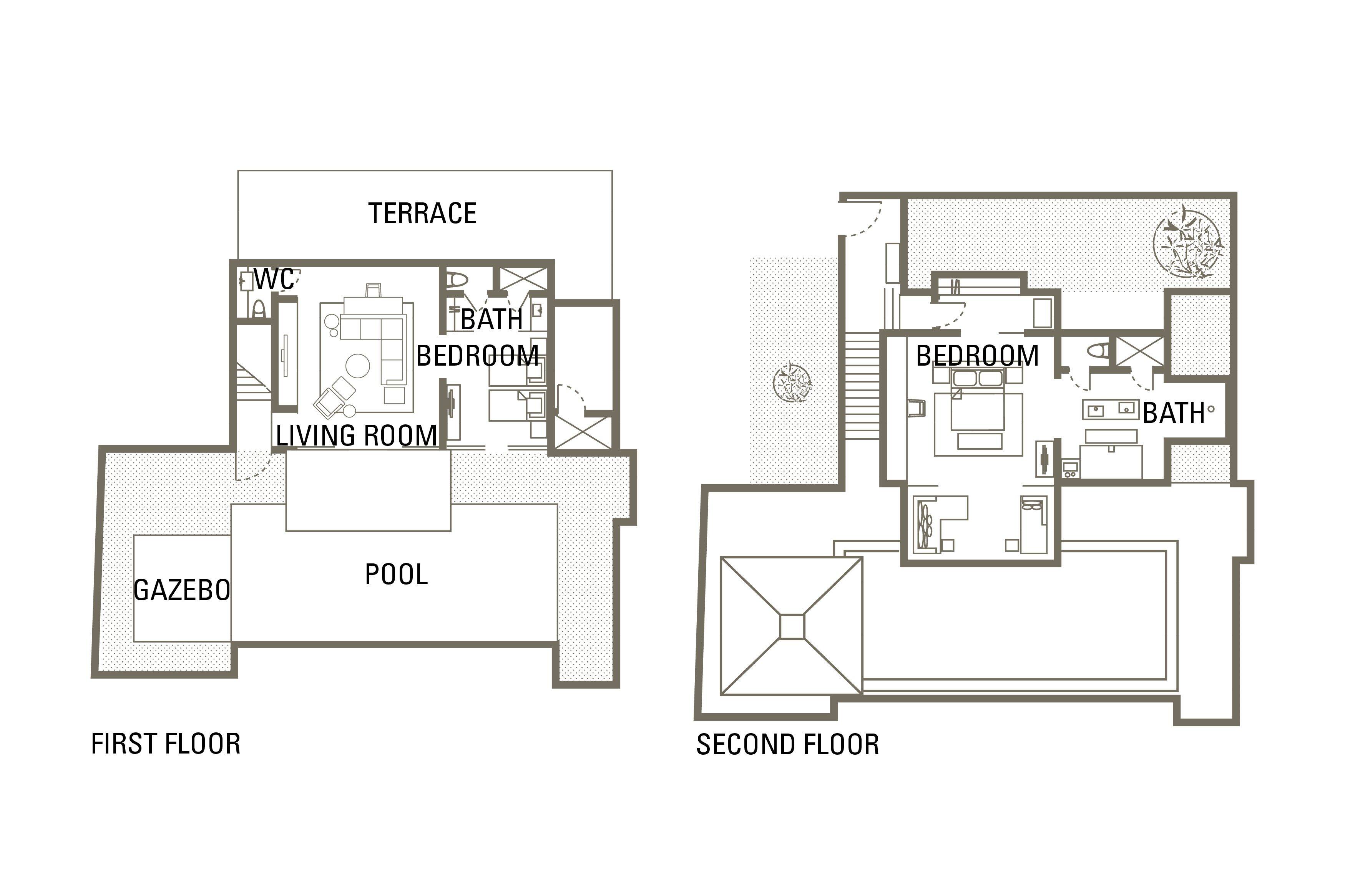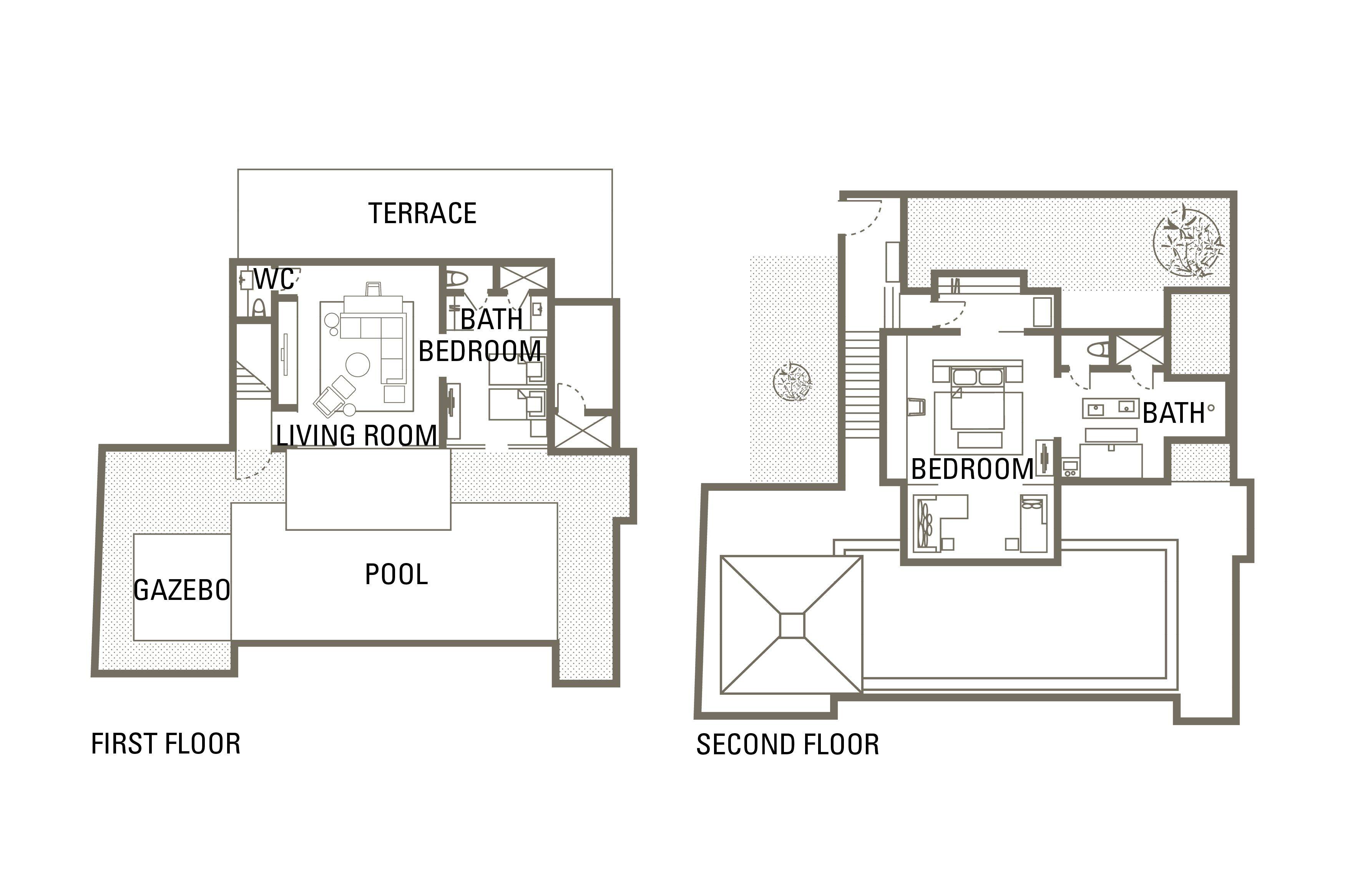 Пляжная вилла-дуплекс с «французскими» окнами от пола до потолка: на 2 этаже – главная спальня с двуспальной кроватью king size и гостевой зоной, ванная комната с ванной и душем на открытом воздухе; на 1 этаже – спальня с 2-мя односпальными кроватями, ванная комната с ванной и душевой кабиной, гостиная с обеденной зоной на 4 персоны, выход на меблированную террасу-патио (171м²), тропический душ на открытом воздухе, сад с обеденным столом, пейзажный бассейн и беседка-газебо, панорамный вид на океан; есть смежные виллы; эксклюзивные привилегии*; план номера;
