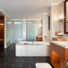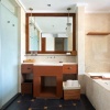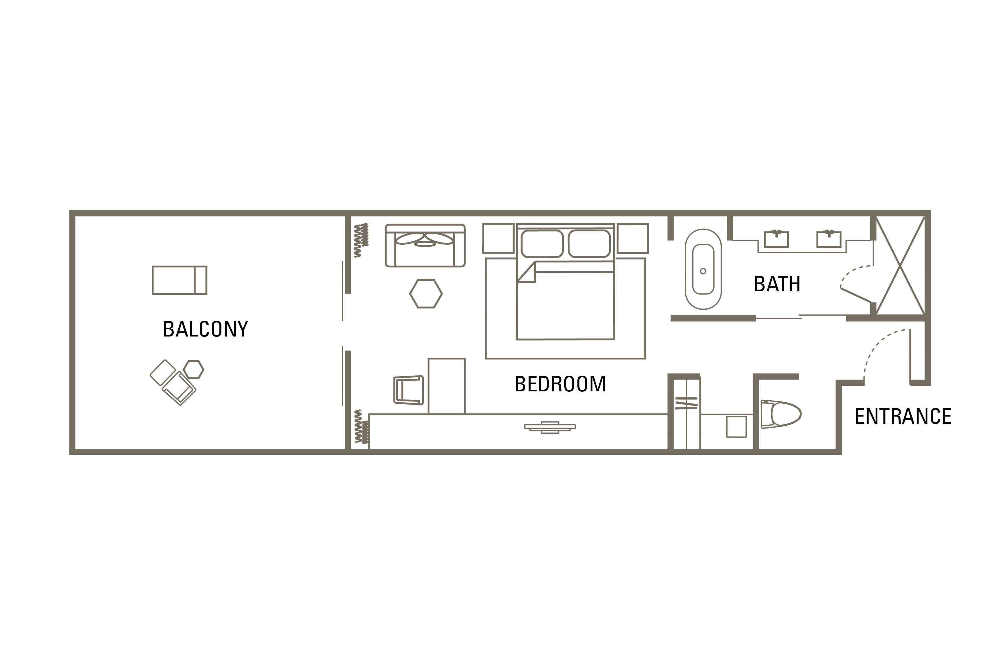Номер-павильон на 1 этаже, в корпусах вдоль набережной: 1 двуспальная кровать king size, гостевая зона с диваном, ванная комната с душевой кабиной и ванной с оконным проемом на меблированную террасу-патио (25 м²), выход к общему для номеров Pool Pavilion King бассейну; вид на море/ сад/ бассейн; план номера;