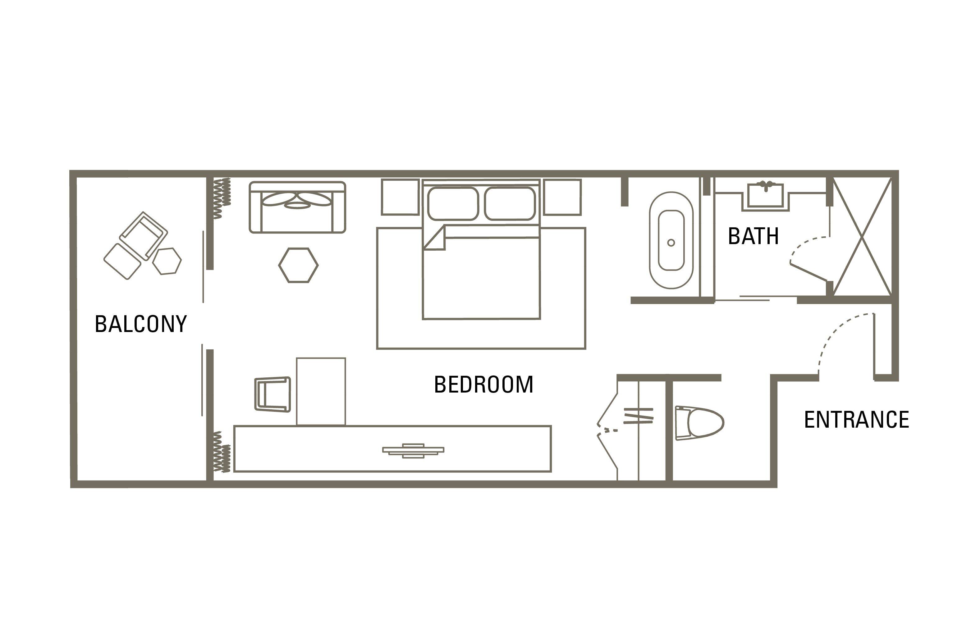 Номер на 2–5* этажах: 1 двуспальная кровать king size или 2 односпальные кровати, гостевой уголок с диваном, ванная комната с душевой кабиной и ванной, меблированный балкон/ терраса (7м²/18 м²), вид на сад/ море; план номера; есть смежные номера;
