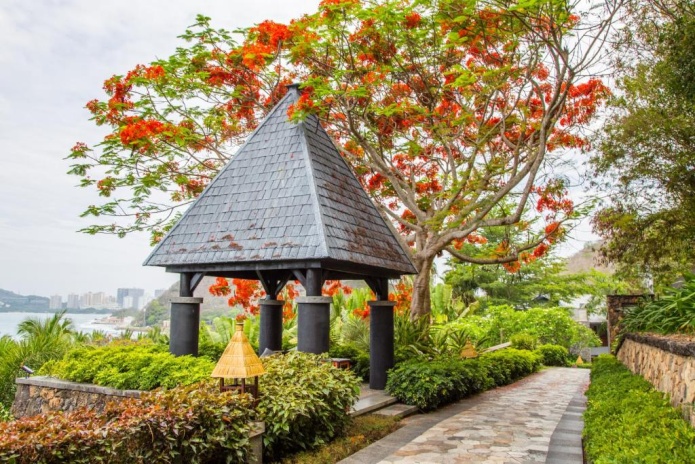 Вилла-дуплекс на склоне холма, «французские» окна от пола до потолка: на 2 этаже – главная спальня с двуспальной кроватью king size и гостевой зоной, собственная ванная комната с джакузи у окна и тропическим душем; на 1 этаже – спальня с 2-мя односпальными кроватями, ванная комната с ванной и душевой кабиной, гостиная, обеденная зона на 4 персоны, выход на меблированную террасу-патио (171м², сад с обеденным столом, бассейн и беседка-газебо, вид на сад/ океан; есть смежные виллы; эксклюзивные привилегии**; план номера;