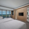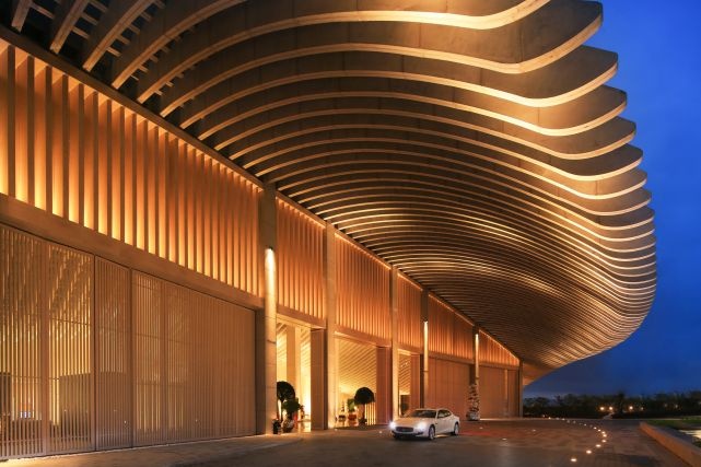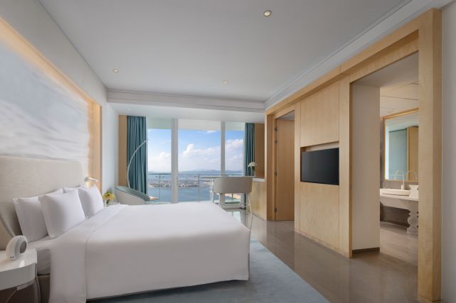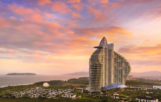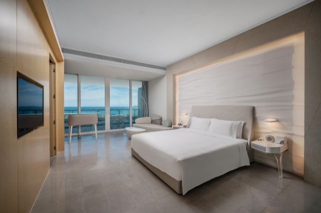 Mangrove Tree Resort Haitangbay состоит из одного 33-х этажного здания. Фойе отеля оформлено в стиле «храма света и тени» с авторским дизайном Милана Шипека: серый бетон, инсталляции, преломление света и эффектная стальная «радуга» на потолке создают атмосферу современного арт-пространства. Коридоры с «небесными садами» и световыми эффектами напоминают путешествие во времени. В отеле — 508 номеров, включая 18 двухуровневых люксов с панорамным видом на море (дизайн в стиле Star Alliance) и 29 вилл с садом и частным бассейном. Все номера предлагают 180° вид на море, стильный интерьер и максимальный комфорт. На 33-м этаже — вертолётная площадка с возможностью прямого прилёта. Круглосуточный батлер-сервис на виллах обеспечивает высокий уровень приватности и сервиса.