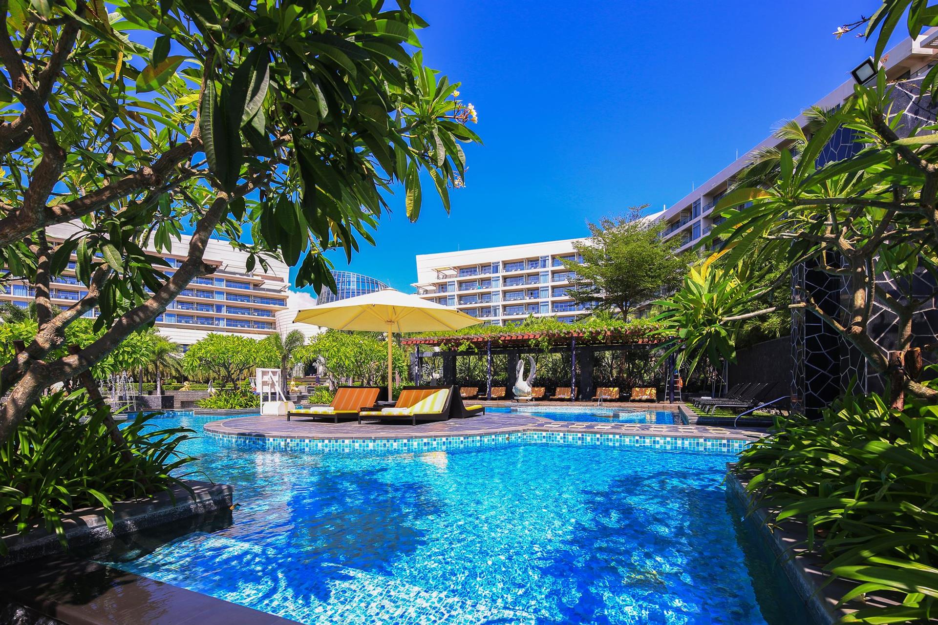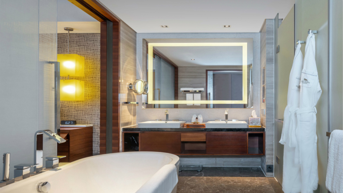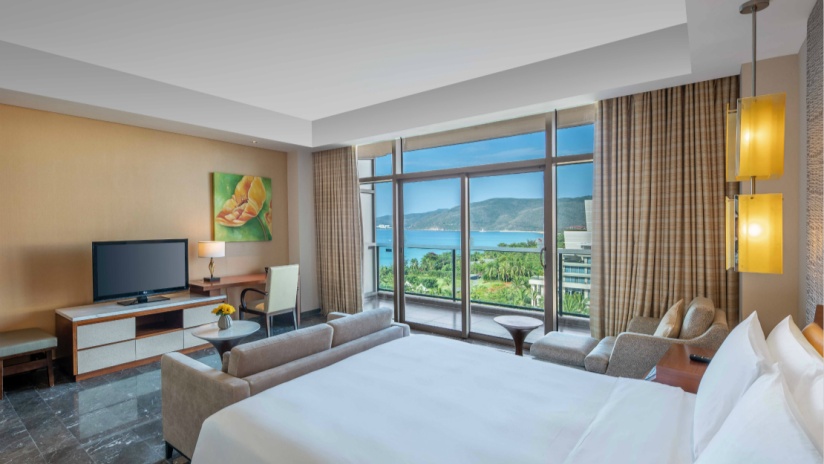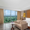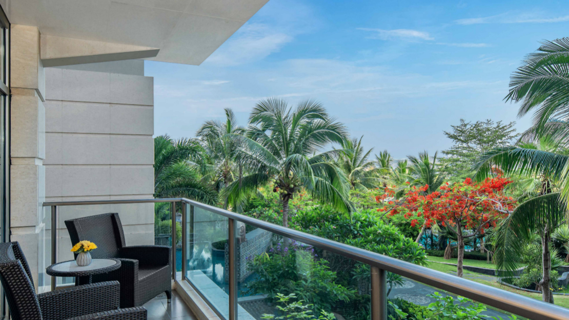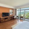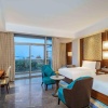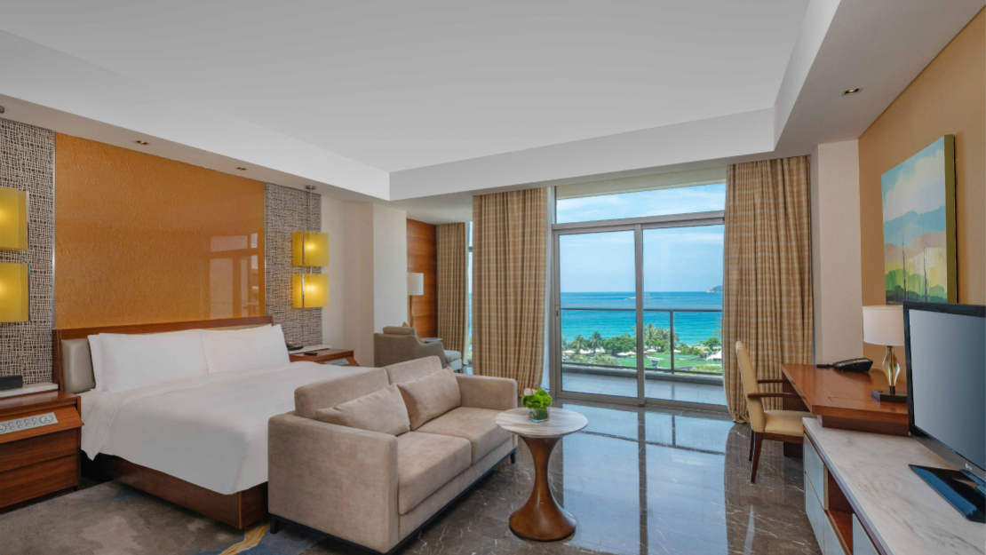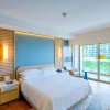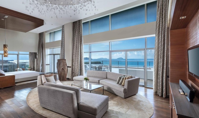 Просторный двухкомнатный сьют на 5–9 этажах: спальня с двуспальной кроватью king-size, ванная комната с ванной и душем, гостиная с зоной отдыха и обеденной зоной, меблированный балкон, панорамный вид на океан;