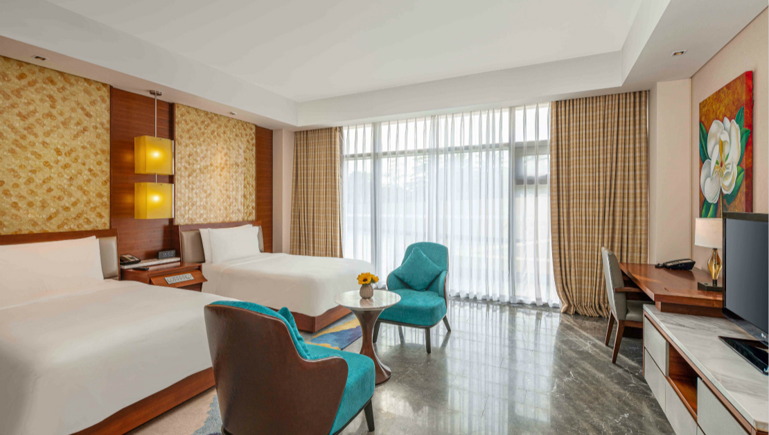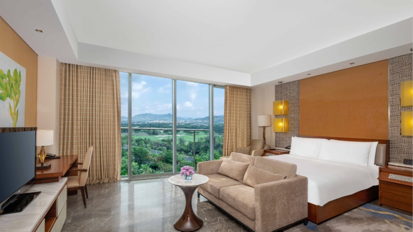 Номер на 3–9 этажах***: двуспальная или 2 односпальные кровати, ванная комната с ванной и душем, без балкона, с окном от пола до потолка, вид на поле для гольфа;
