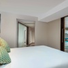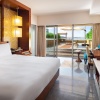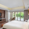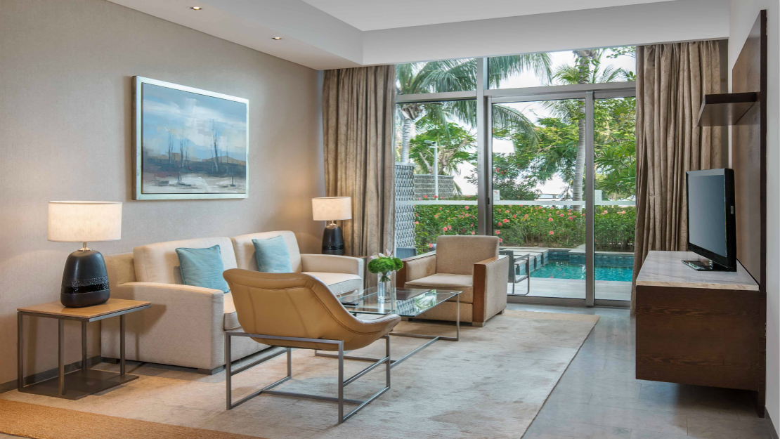 Двухкомнатный сьют на 1 этаже: спальня с двуспальной кроватью king-size, ванная комната с ванной и душем, гостиная, меблированная терраса и бассейн с прямым доступом к лагуне, окружающей корпус T2, вид на сад/лагуну;