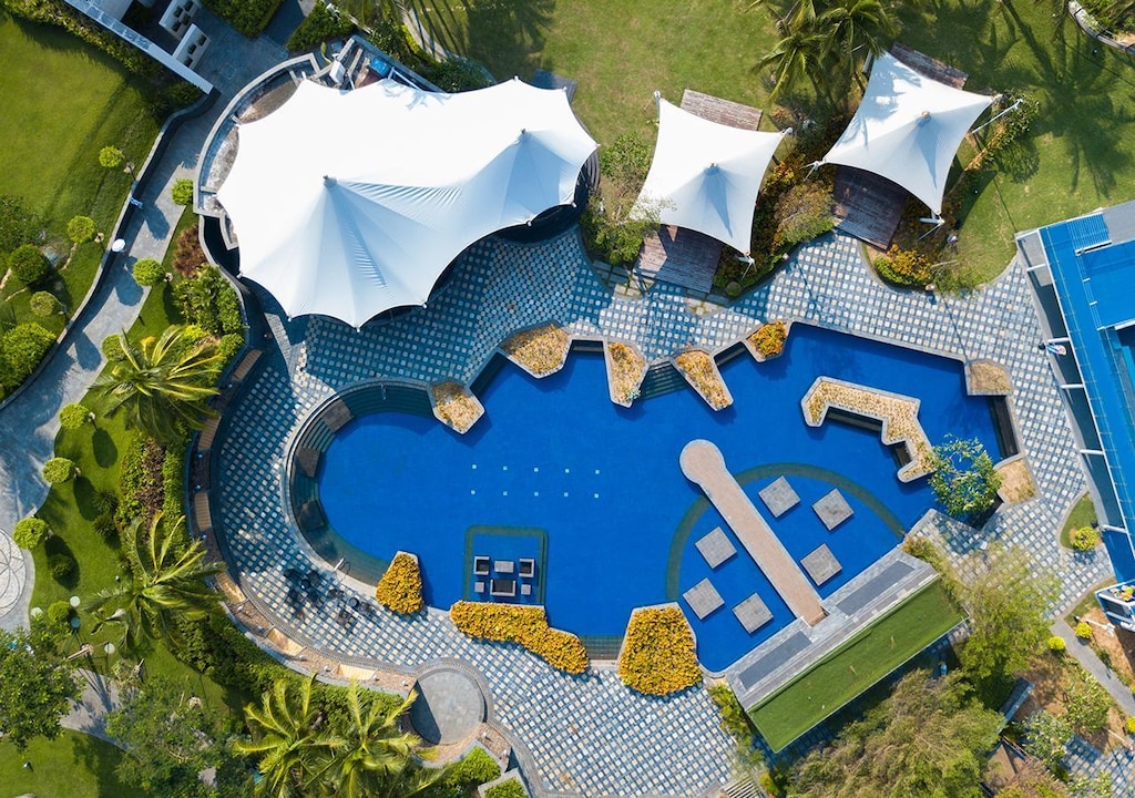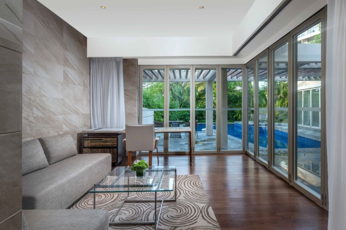 Отдельная вилла c 3-мя спальнями: стеклянные двери от пола до потолка, в одной спальне – двуспальная кровать, в двух других – по 2 односпальные кровати, в каждой спальне – собственная ванная комната с ванной и душем, гостиная с зоной отдыха, обеденная зона, кухня, кабинет, комната для спа-процедур, меблированная терраса с обеденным столом, сад, собственный бассейн с постоянной температурой воды (глубина 1, 25 м, длина 12 м), душ на свежем воздухе, вид на сад.