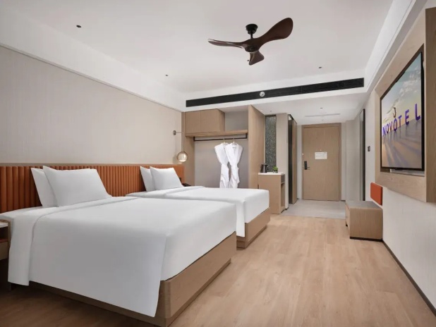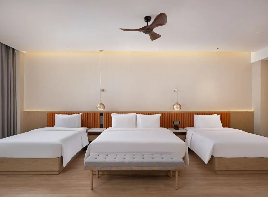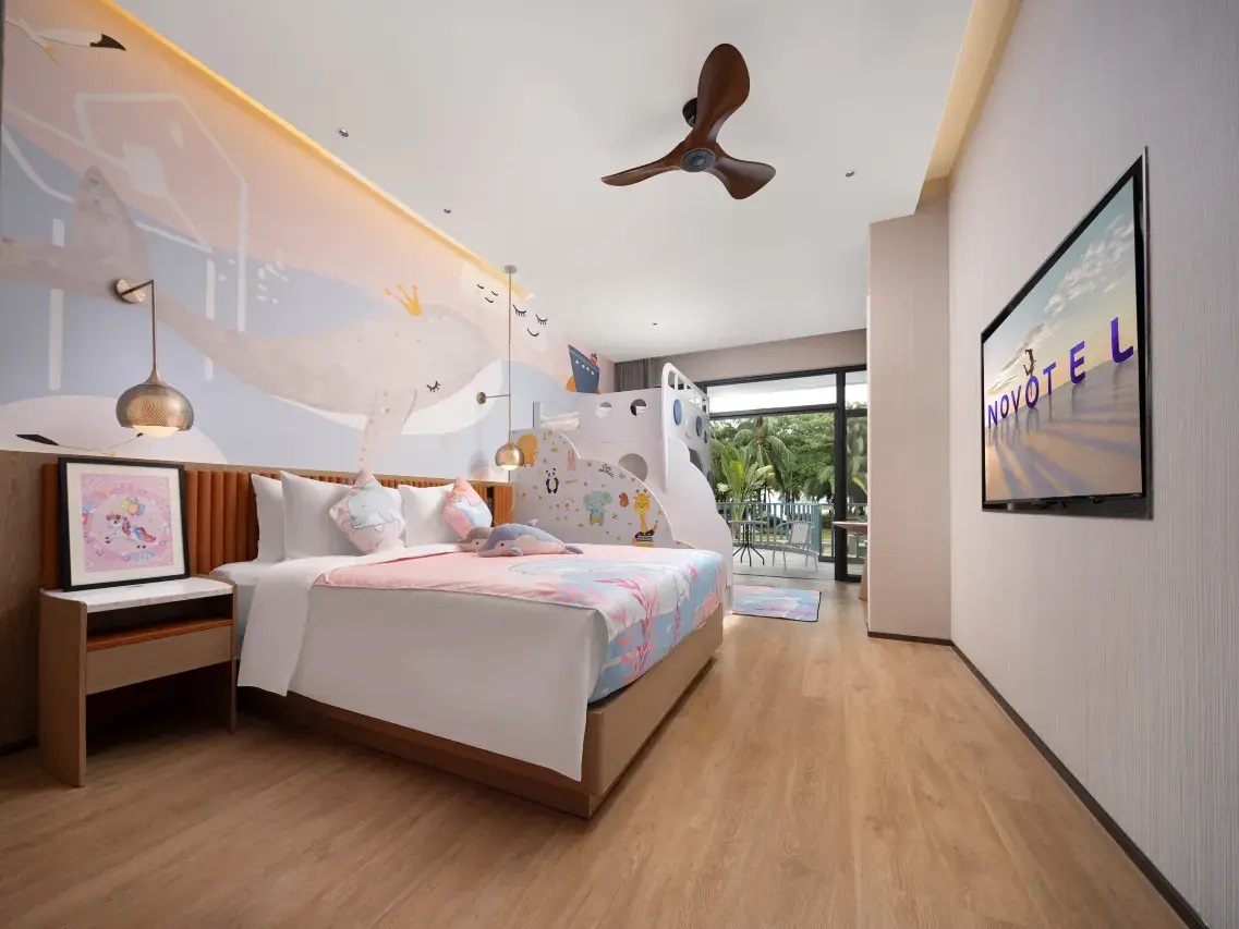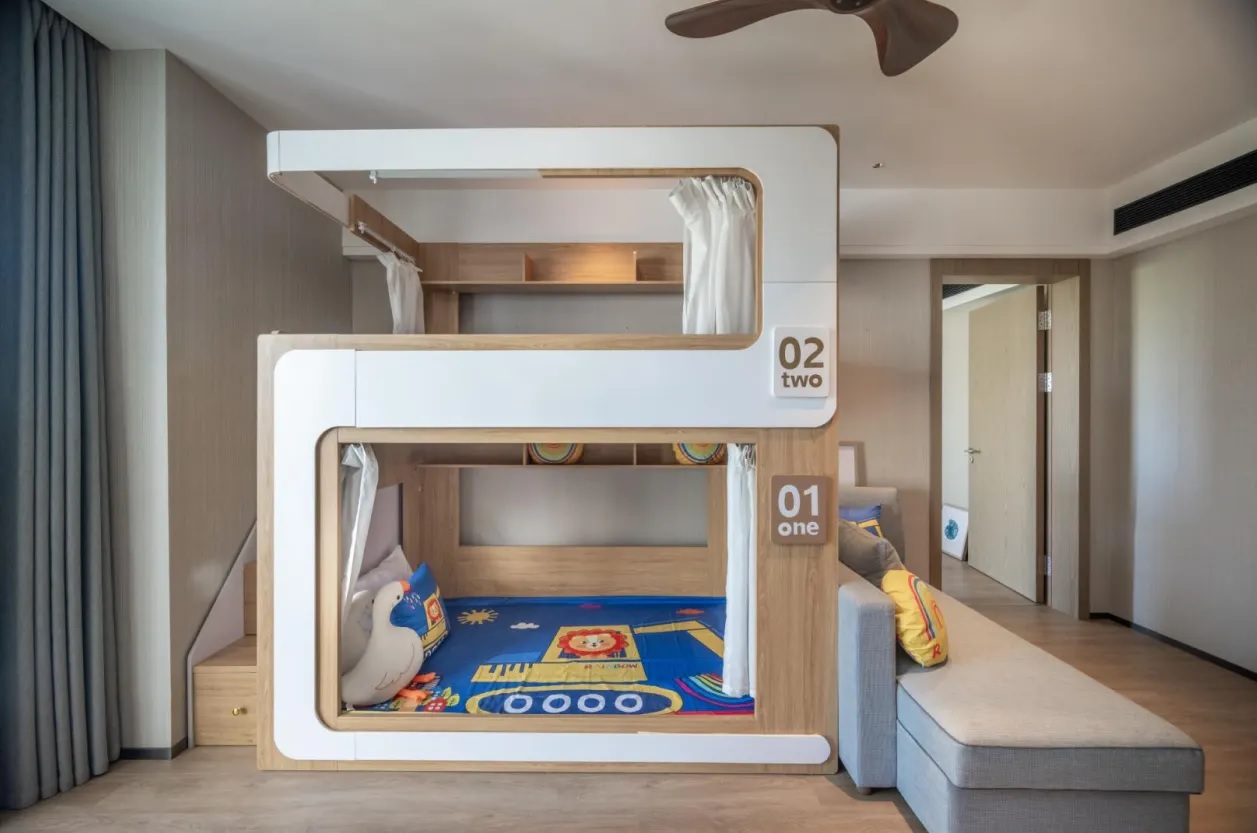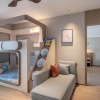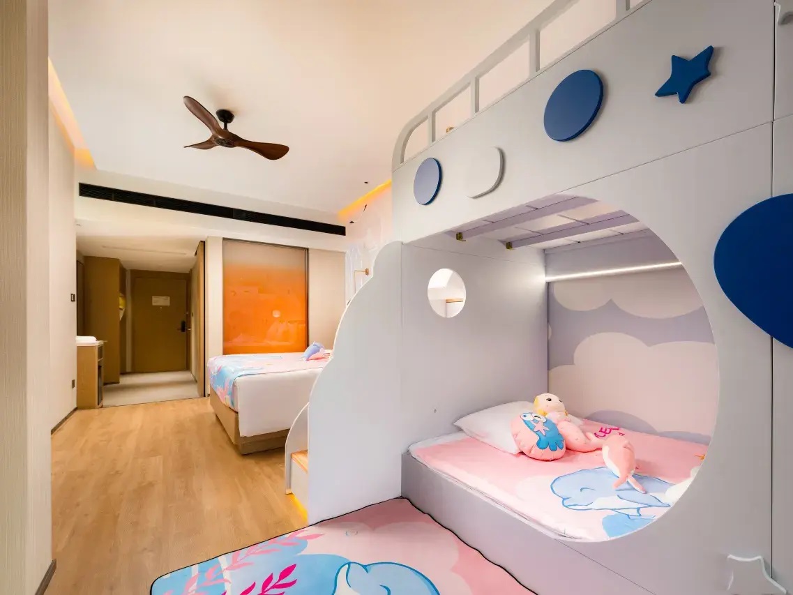 Сьют на 2 – 5 этаже с 2-мя спальнями: двуспальная и двухъярусная кровать (оформление в детской тематике), ванная комната с душем, без балкона, с окном от пола до потолка, вид на океан;