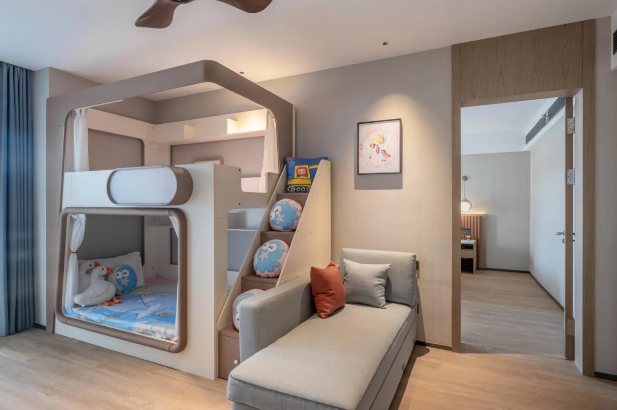 Сьют на 2 – 5, 7 этаже с 2-мя спальнями: двуспальная и двухъярусная кровать (оформление в детской тематике), ванная комната с душем, без балкона, с окном от пола до потолка, вид на сад;
