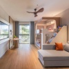 Сьют открытой планировки на 1 этаже: спальня с 1-ой двуспальной и 2-мя односпальными кроватями отделена перегородкой от зоны гостиной, ванная комната с душем и ванной, окна от пола до потолка, вид на сад/ на океан.