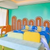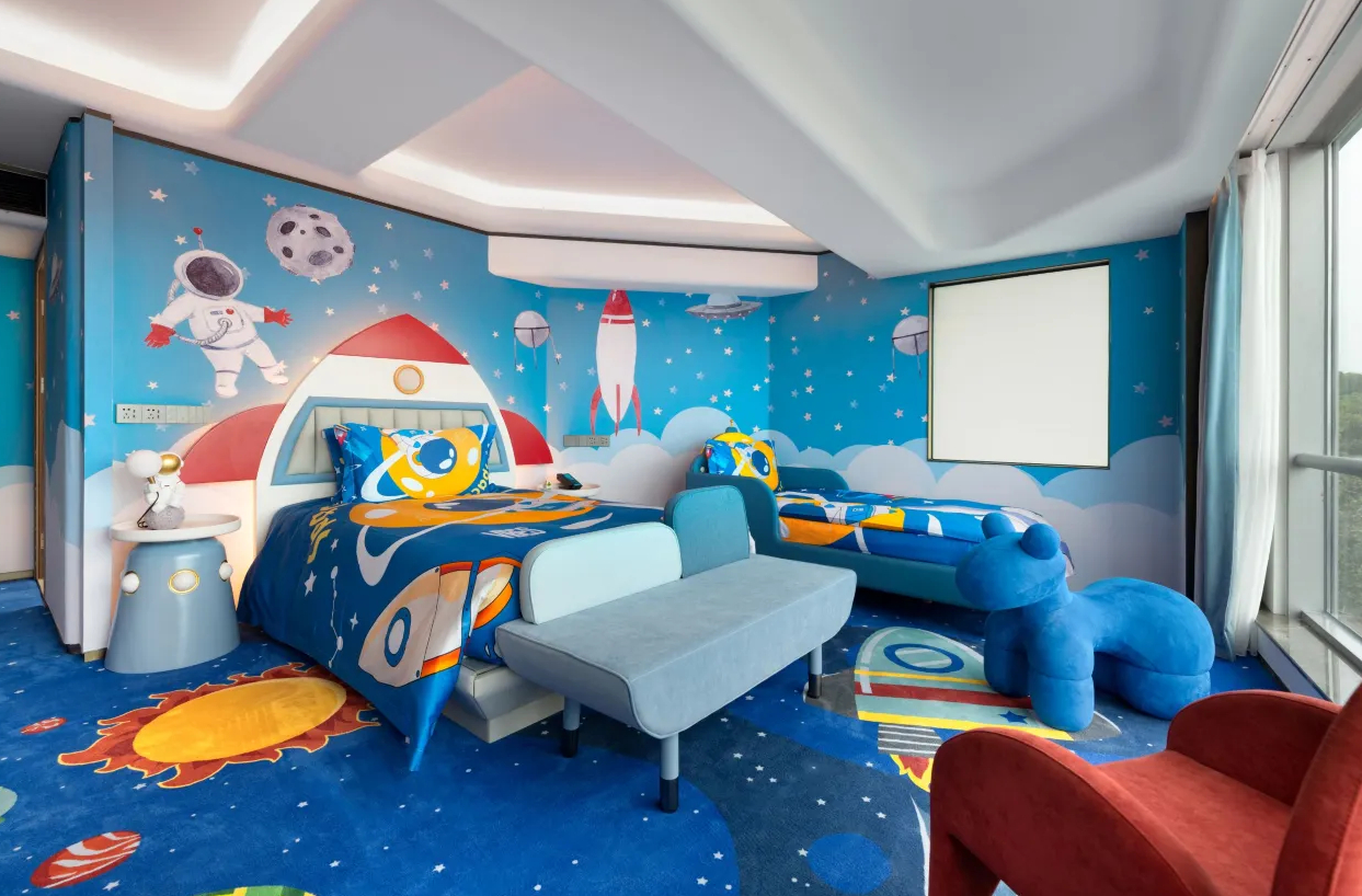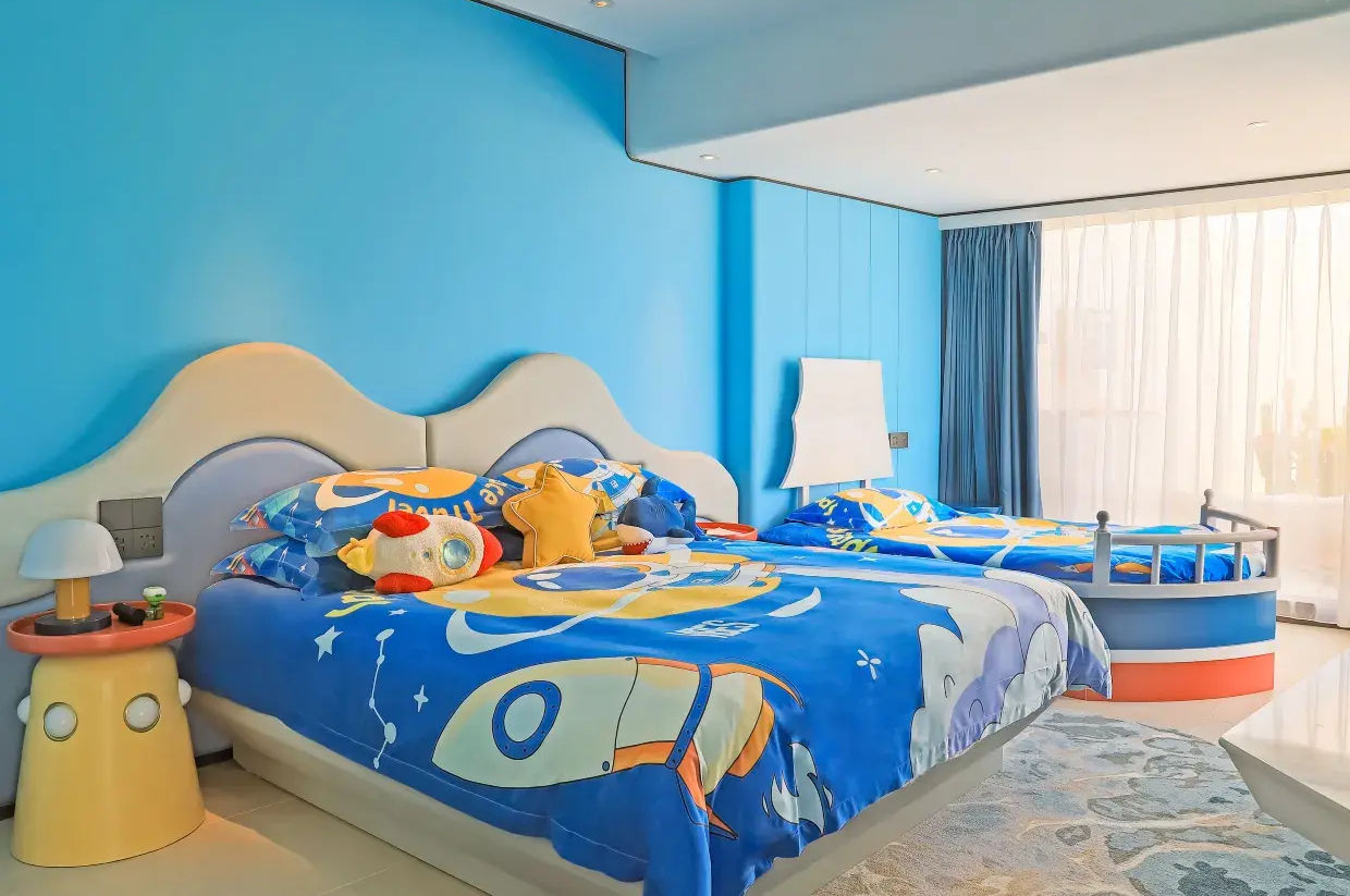 3 этаж, семейный люкс с детской «космической» тематикой: отдельная спальня с двуспальной кроватью (ширина 1,5 м) и односпальной кроватью (ширина 0,9 м), отдельная гостиная с диваном, отдельная ванная комната с душевой кабиной и двойной раковиной, без балкона, вид на море;