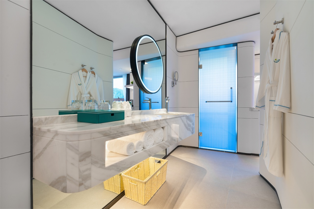 В номерах ванная комната отделена от жилой зоны сдвижными матовыми перегородками, в люксах - раздвижными дверьми.