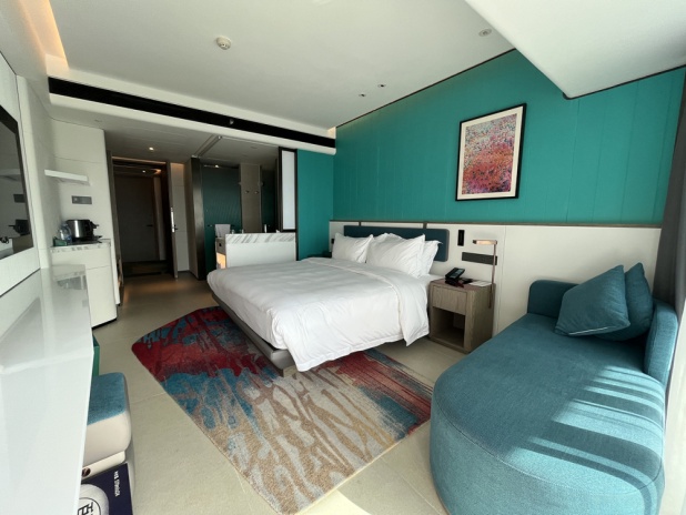 8 этаж, двуспальная кровать queen size (ширина 1,8 м) и односпальная кровать (ширина 1,1 м), ванная комната с душевой кабиной, балкон, панорамный вид на море с высокого этажа;
