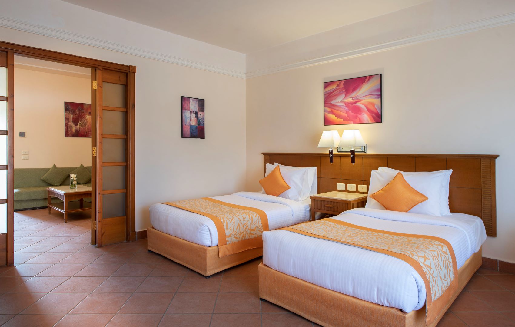 Двухкомнатный семейный номер: главная спальня с 1-й двуспальной/ 2-мя односпальными кроватями и гостевым уголком, отдельная зона в холле с 2-мя односпальными кроватями, ванная комната с душевой кабиной, меблированный балкон, вид на бассейн, (дизайн номеров может немного отличаться);