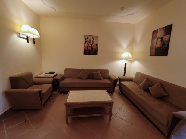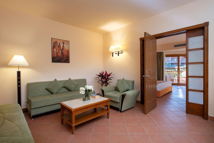 Двухкомнатный семейный люкс: спальня с 1-й двуспальной/2-мя односпальными кроватями и гостевым уголком, гостиная с 2-мя диванами-кроватями, 2 телевизора, ванная комната с душевой кабиной, меблированный балкон, вид на бассейн и сад.