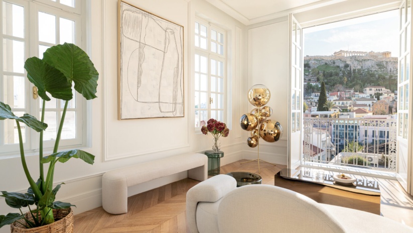 Особенности: отдельная зона для отдыха и обеденная зона. Вид на Акрополь из спальни и гостиной. Душ для двоих с видом на Акрополь. Множество больших окон или дверей на балкон с обилием естественного света;