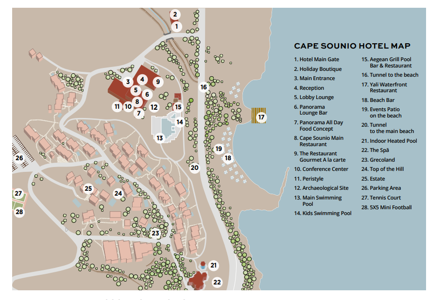 К услугам гостей 2 оборудованных частных пляжа, спа-центр с фитнес-залом и сауной, детские клубы и бассейн, 5 ресторанов, бунгало и виллы в сосновом лесу. Из большинства номеров открываются великолепные виды на море и античный храм Посейдона.