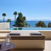 Двуспальная кровать king-size, гардеробная, диван-кровать, ванная комната с душем, меблированный балкон и панорамные окна (шезлонг у бассейна, кофейный столик, ковер, лаунж-кресла, обеденный стол для зоны отдыха, подвесное кресло), вид на море;