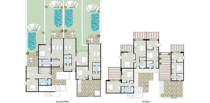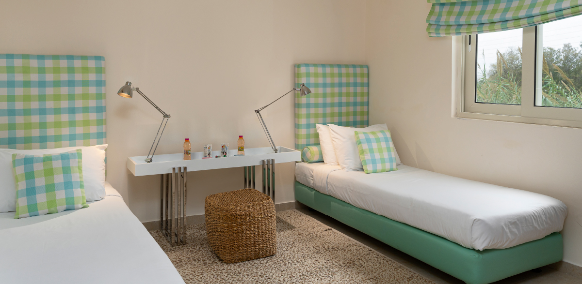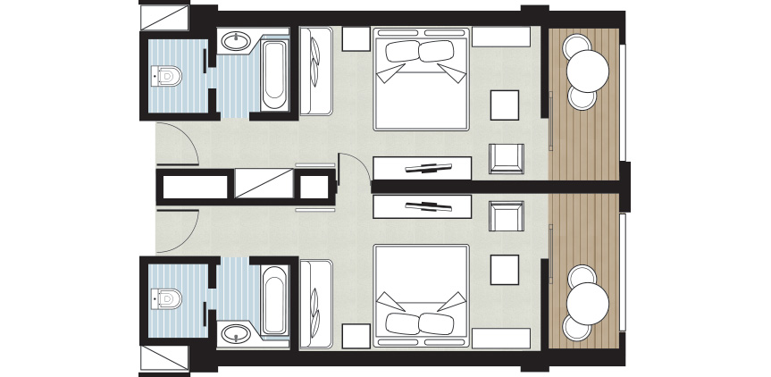 Номера расположены у пляжа на первом и втором этажах (ground и first floor), прямой вид на море, 2 спальни с двуспальными кроватями, 2 гостиные зоны с односпальным диваном-софа, 2 ванные комнаты с душем, терраса или балкон, общая внешняя площадь – 18 м², план номера, фото номера;