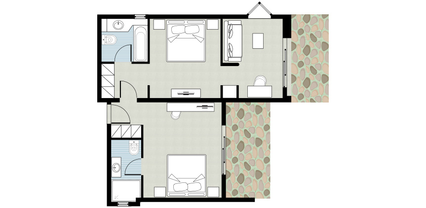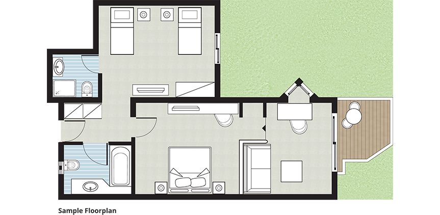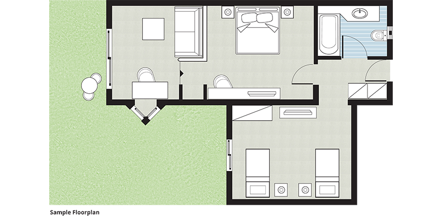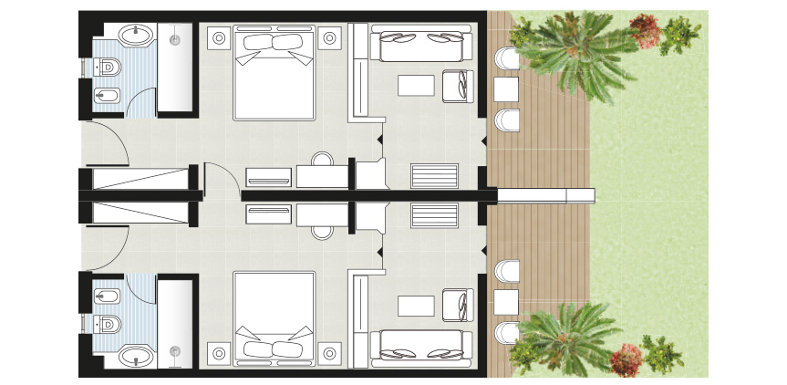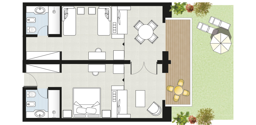 Номера расположены в саду на первом (ground floor) этаже, 2 спальни (двуспальная кровать и 2 односпальные кровати), зона гостиной с диваном-софа, 2 ванные комнаты (одна с ванной, другая с душем), вид на сад, терраса (9 – 15 м²), план номера, фото номера;