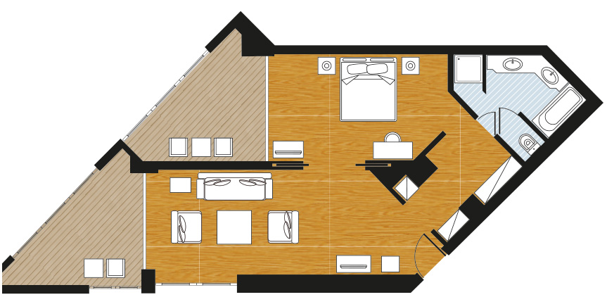Пентхаус в основном здании, панорамный вид на море, спальня с кроватью king-size, гостиная или вторая спальная зона (между комнатами раздвижная дверь, с 2 односпальными кроватями – по запросу), ванная комната с двумя раковинами, ванной и отдельной душевой кабиной, балкон 20 м², план номера, фото номера;