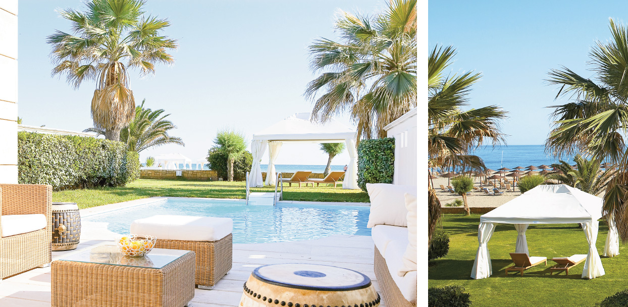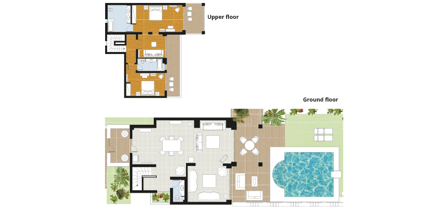 Номера расположены у пляжа, прямой вид на море, спальня с кроватью king-size, гостиная комната с односпальным софа-диваном, ванная комната с одной раковиной, гидромассажной ванной и отдельной душевой кабиной, терраса, собственный бассейн (до 23 м²), частная беседка, приватный входной дворик, общая внешняя площадь – 30 м², прямой выход к пляжу, план номера, фото номера;