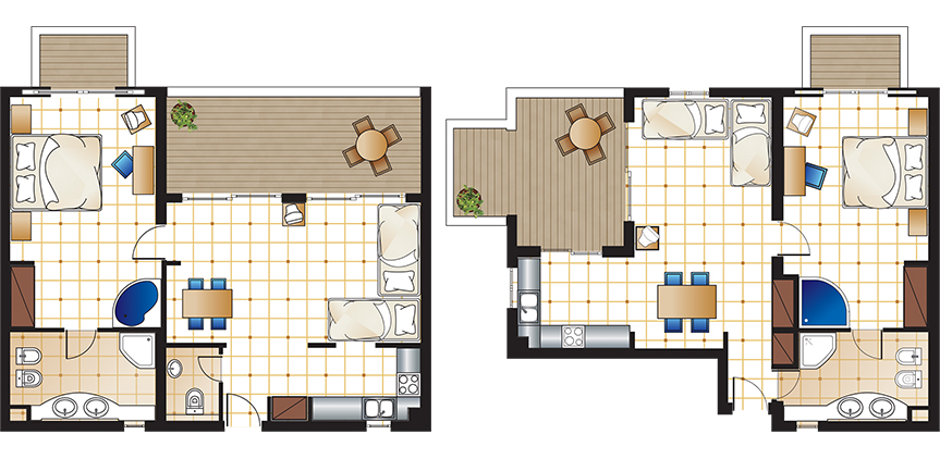 Семейные номера на первом – втором этажах, 2 спальни с двуспальными кроватями king-size и ванными комнатами с ванной (в одной спальне есть ещё диван и кухонный уголок), гостиная комната с диваном, кухней и обеденной зоной, балкон или терраса, вид на сад/бассейн, см.план номера, см.фото номера.