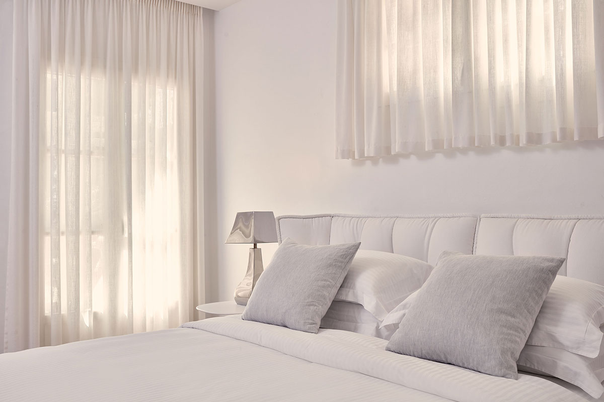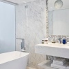 Интерьеры выполнены в современном стиле с белым мрамором, деревянными элементами и дизайнерским освещением.