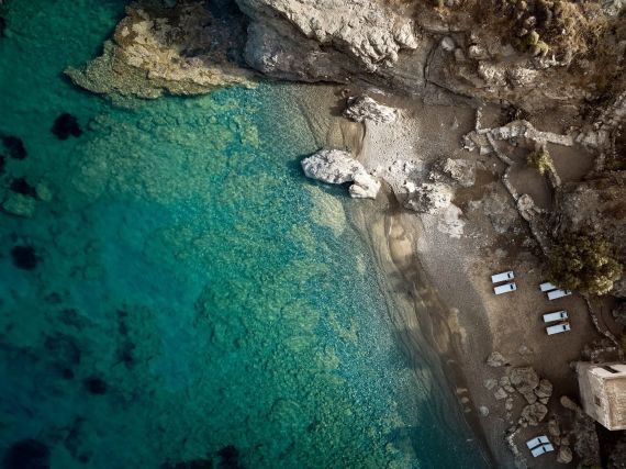 Спальня с двуспальной кроватью, гостиная с диваном-софа и обеденной зоной, ванная комната с душем, веранда, на веранде – гидромассажная ванна, шезлонги, обеденный стол (внешняя площадь – 100 м²); панорамный вид на море, см. план номера;