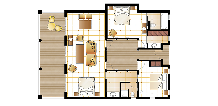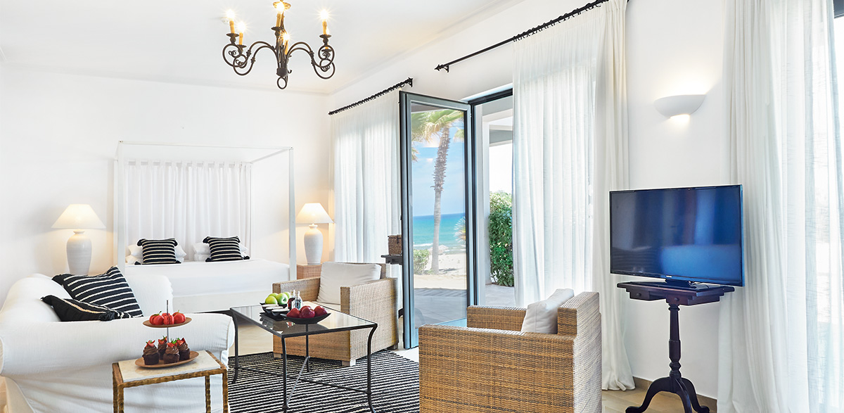 Расположены на пляже, вид на море, 2 спальни: двуспальная кровать king-size и 3 односпальные кровати, гостиная комната с обеденной зоной, 2 ванные комнаты (одна с душем и другая с ванной), терраса 30 м² с зонтиками и шезлонгами, см.план номера, см.фото номера.