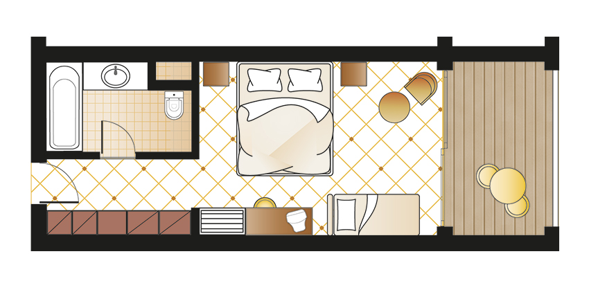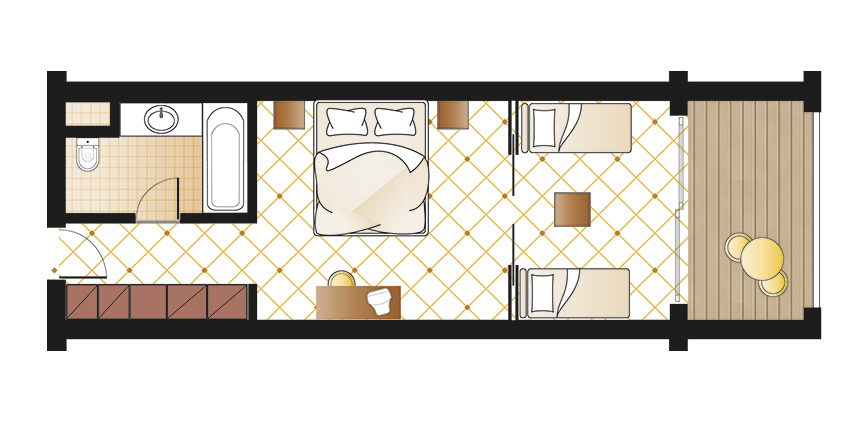 Номера расположены в основном здании на верхних этажах, прямой вид на море, 2 спальни (раздвижная дверь между комнатами): двуспальная кровать queen-size или 2 односпальные кровати + 1 дополнительная односпальная кровать, ванная комната с ванной, балкон 7 м², см.план номера, см.фото номера;
