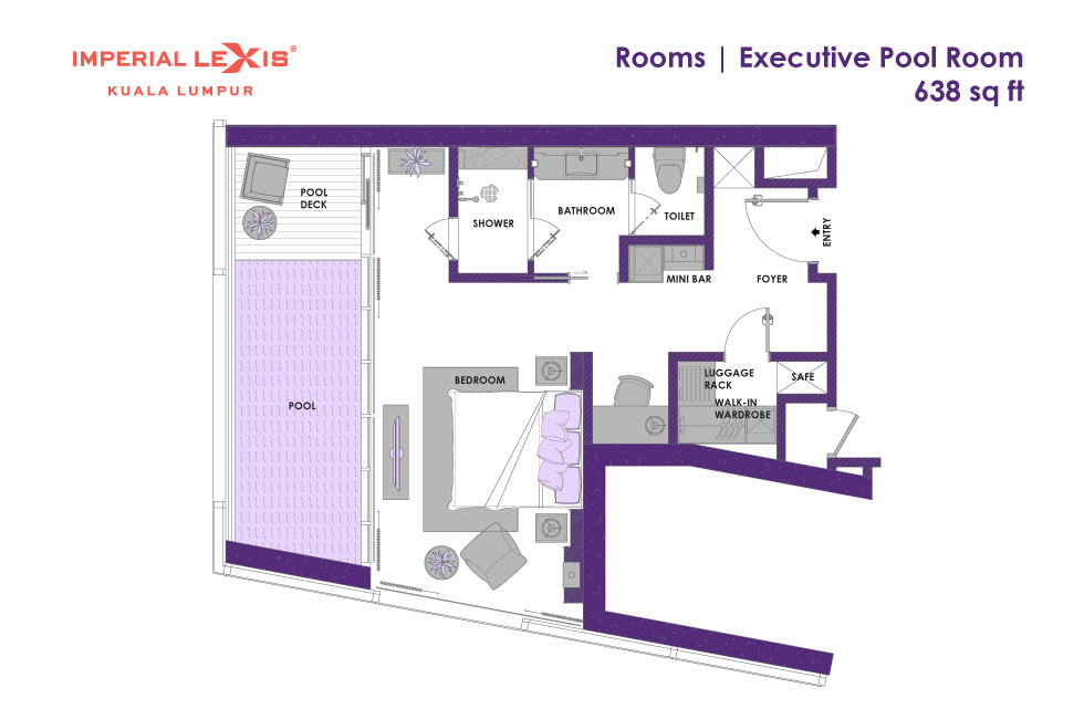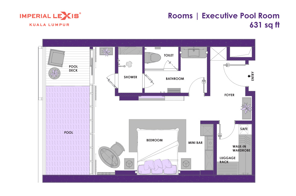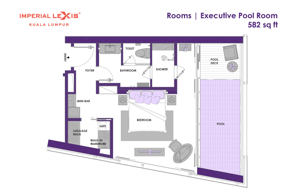 Представительский номер с 1-ой двуспальной кроватью, ванная комната с душевой кабиной, гардеробная, гостевая зона, балкон с частным бассейном (без подогрева), вид на город, вид на башни-близнецы, план номера вар.1, план номера вар.2, план номера вар.3, план номера вар.4;