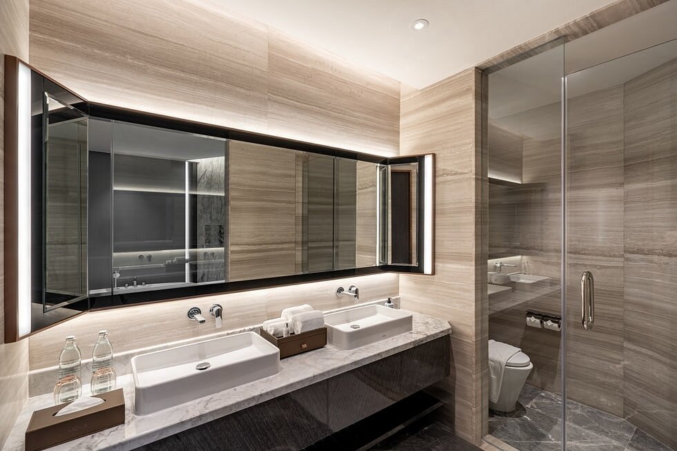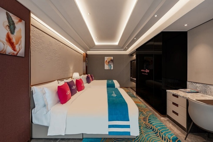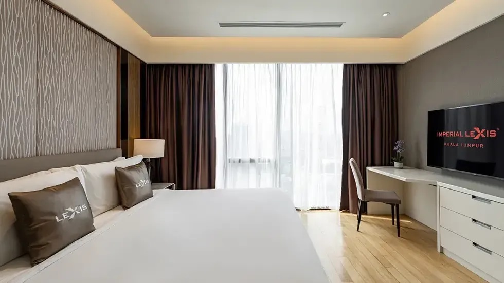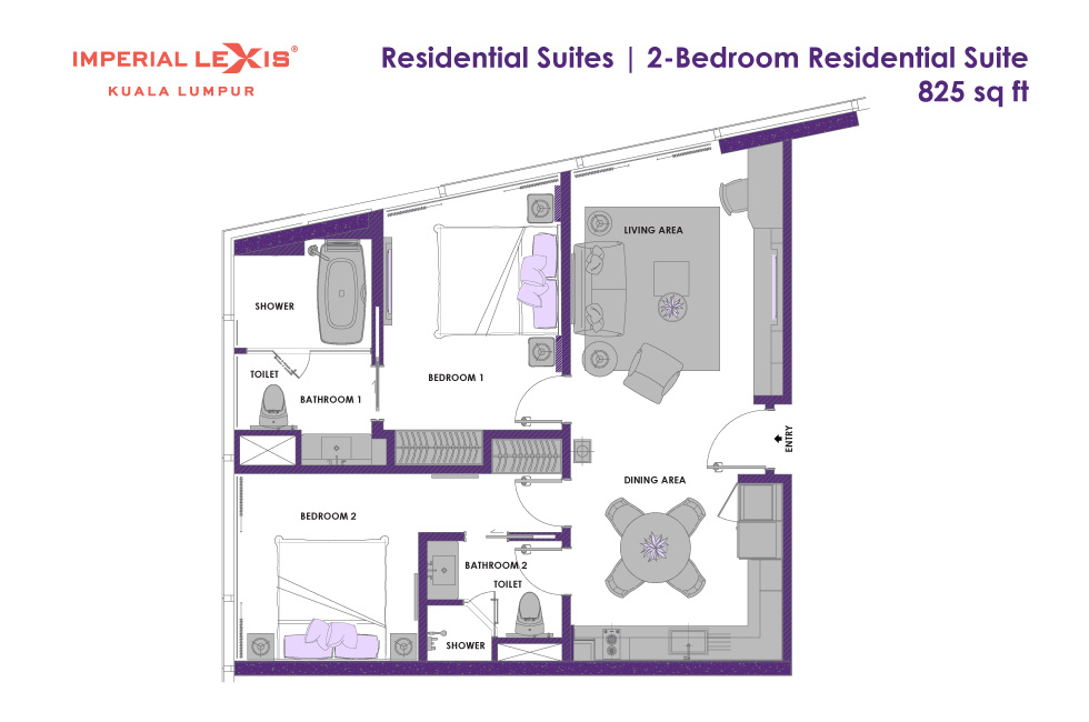 Сьют–апартаменты с 2-мя спальнями на 36-45 этажах: каждая с двуспальной кроватью и собственной ванной комнатой с душем (ванная комната главной спальни с душем и ванной), отдельная гостиная, обеденная зона со столом на 4 персоны и мини-кухня: холодильник, СВЧ-печь, плита, раковина, шкафы для хранения, стиральная и сушильная машины, вид на башни-близнецы; план номера вар.1, план номера вар.2, план номера вар.3;