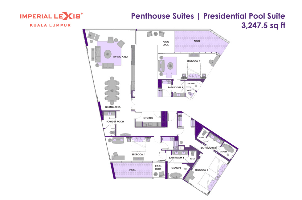 Императорский сьют на 50 этаже: 3 спальни с двуспальной кроватью в каждой, 2 ванные комнаты с ванной и душевой кабиной, 1 ванная комната с душевой кабиной, гардеробная, отдельная гостиная открытой планировки с кухней и столовой (обеденный стол на 6 персон), балкон с просторным частным бассейном (без подогрева), панорамный вид на город; привилегии для проживающих*, план номера;