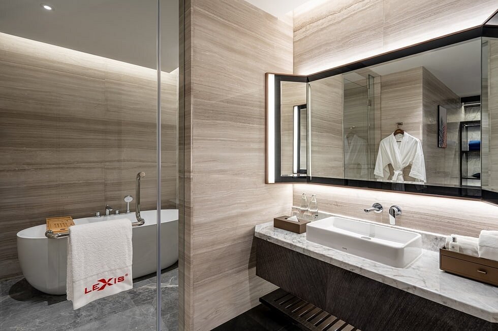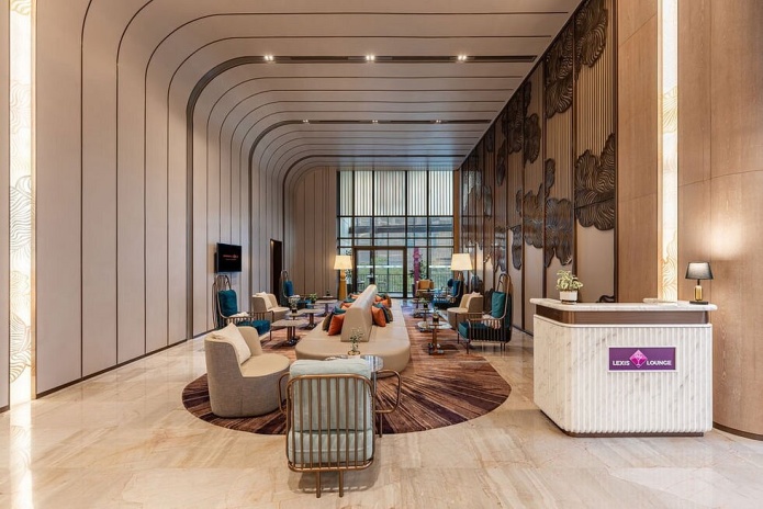 Сьют–апартаменты с 3-мя спальнями расположены на 36–45 этажах: каждая с двуспальной кроватью, 2 спальни с собственной ванной комнатой: одна с душем и ванной, вторая – с душевой кабиной, гардеробная, отдельная гостиная, обеденная зона со столом на 6 персон и мини-кухня: холодильник, СВЧ-печь, плита, раковина, шкафы для хранения, стиральная и сушильная машины, вид на город; план номера;