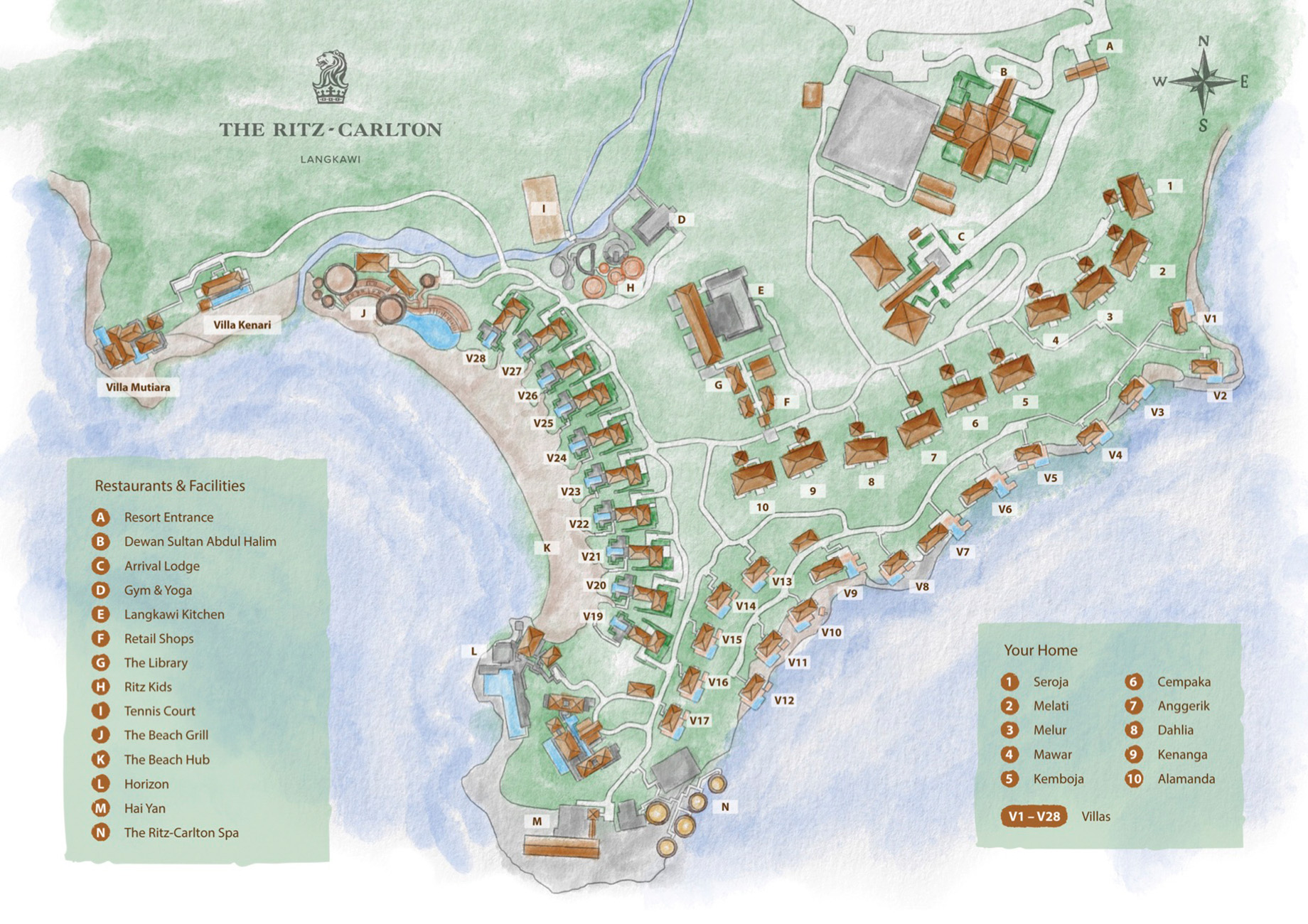 The Ritz-Carlton, Langkawi расположен на юго-западном побережье острова, в уединённой бухте Пантай Кок, среди тропических джунглей, в 30 минутах езды от города Куах.