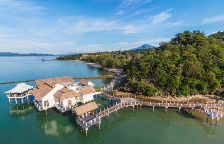 Вилла на сваях над водой (доступ по пирсу): спальня с 1-й двуспальной кроватью, ванная комната с ванной и душевой кабиной, гардеробная, отдельная гостиная с обеденной зоной, мини-кухня с кухонными принадлежностями, просторная меблированная терраса-патио, небольшой частный бассейн, вид на море и на закат;