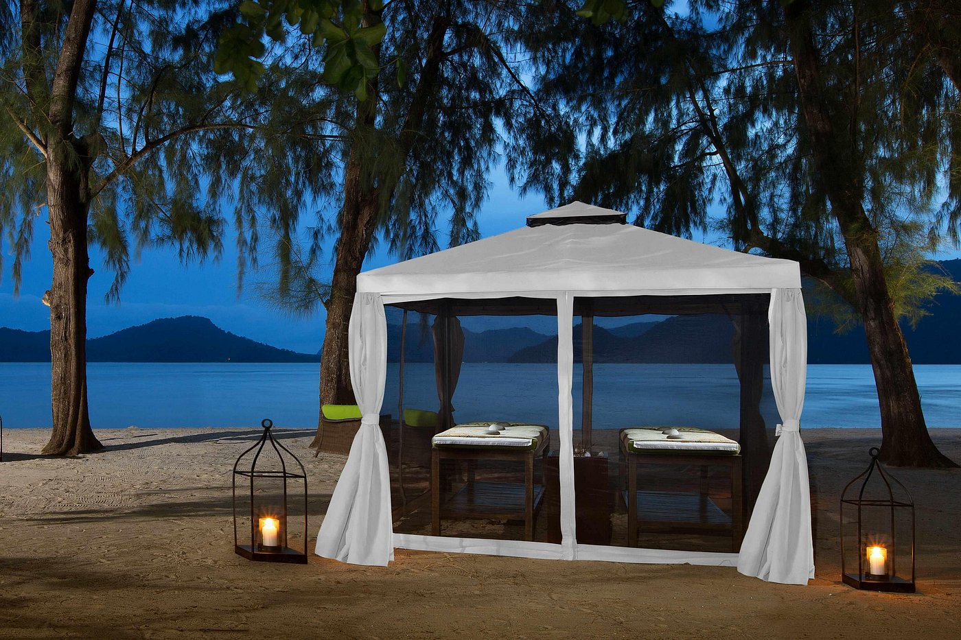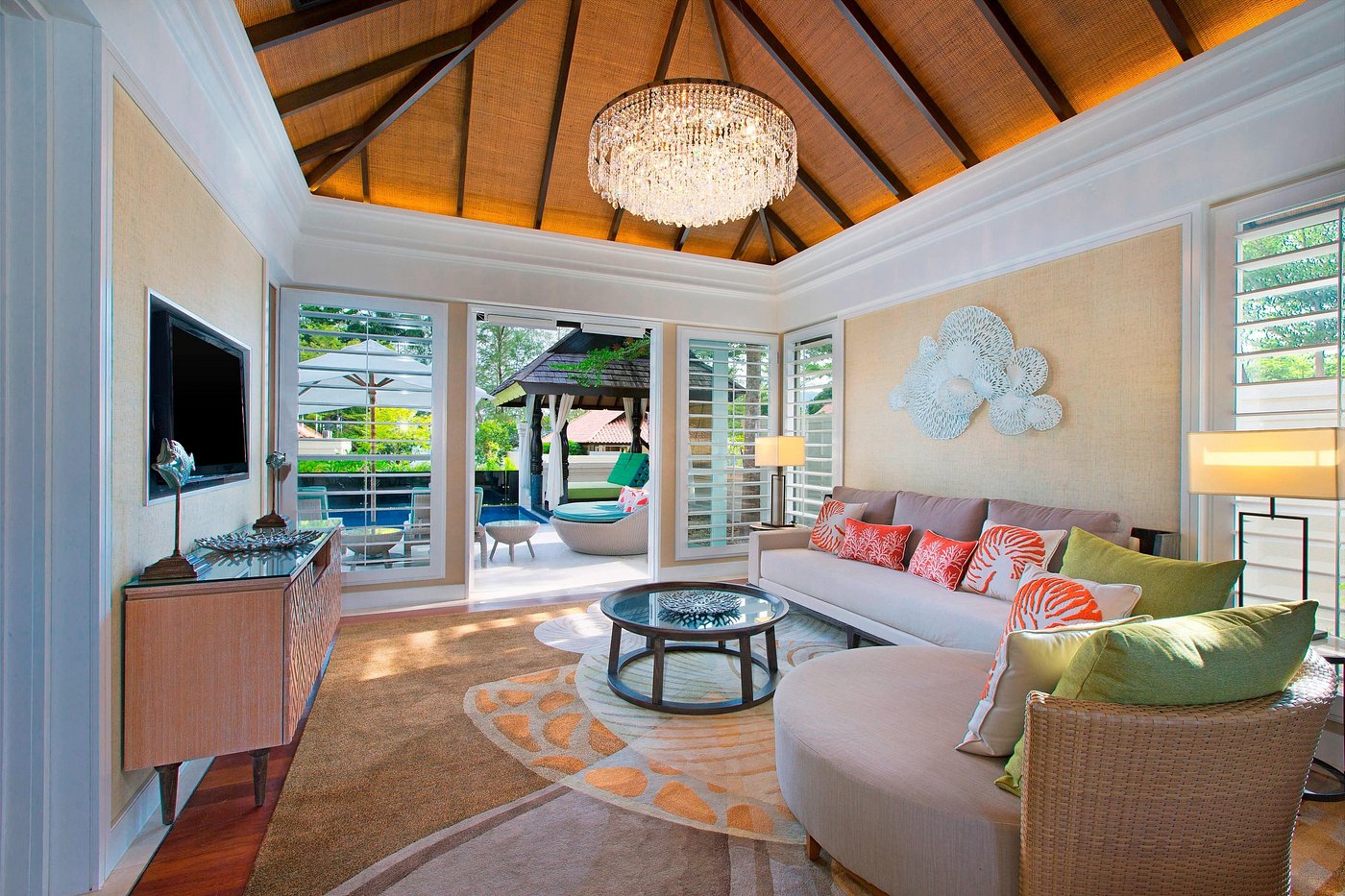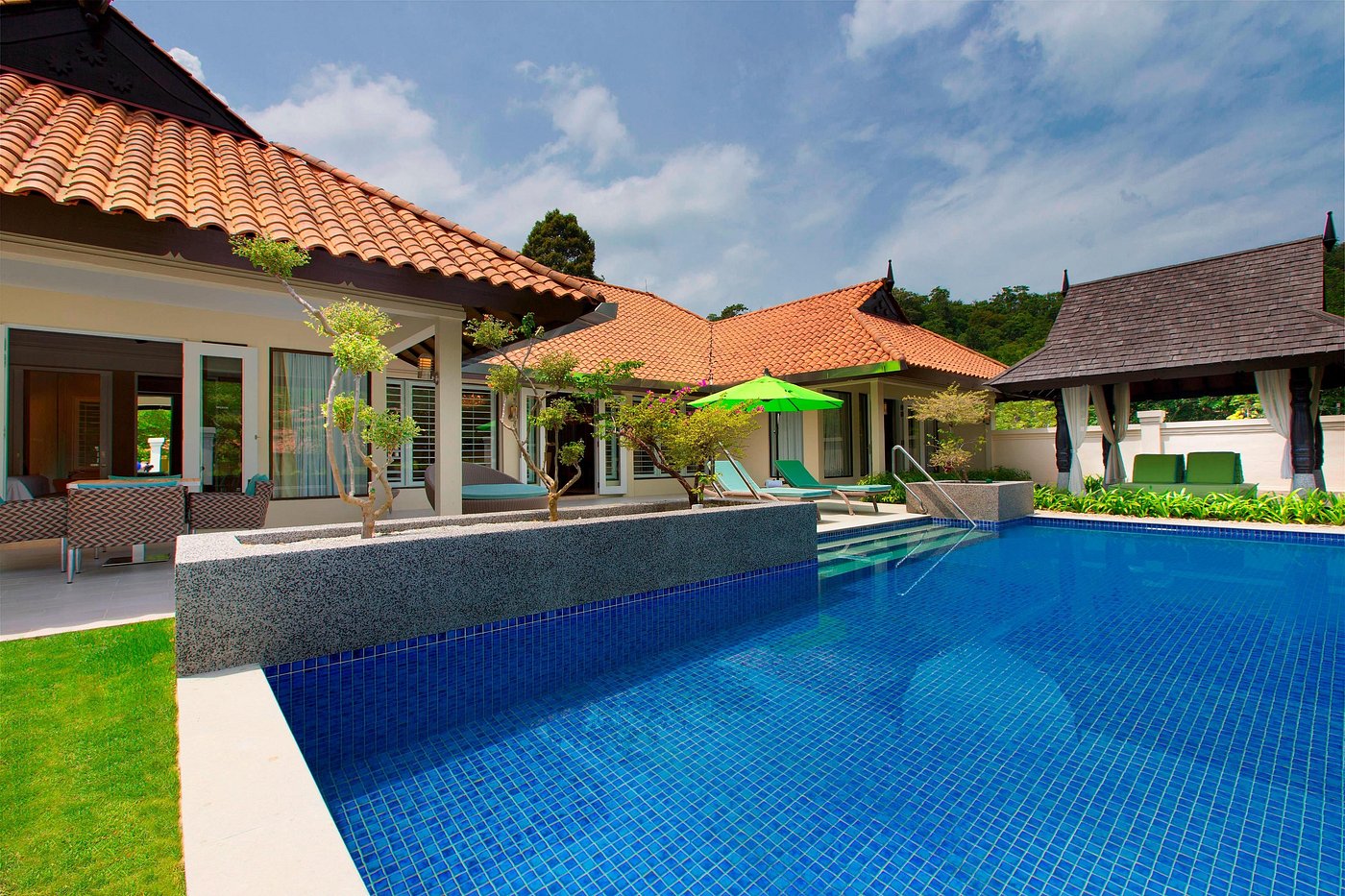 Вилла с 2-мя спальнями: с одной двуспальной и 2-мя односпальными кроватями, 2 ванные комнаты с ванной и душевой кабиной, отдельная гостиная, обеденная зона и мини-кухня (СВЧ-печь, кофеварка, чайник), меблированная терраса (зонты, шезлонги), беседка, душ на открытом воздухе, частный бассейн, вид на территорию отеля/ на сад (отличаются расположением на территории отеля: на 1-й линии от пляжа, на 2 линии от пляжа и уединенная вилла недалеко от основного входа);