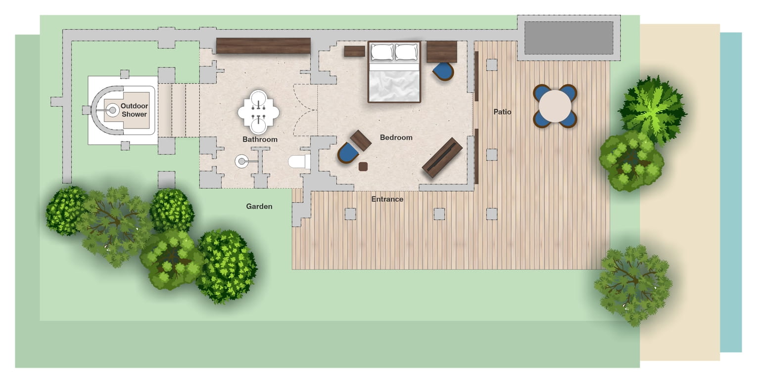 Номер на 1 этаже двухэтажного корпуса: 1 двуспальная кровать, гостевой уголок, ванная комната с душем, ванна и душ на открытом воздухе, меблированная терраса-патио с обеденной зоной, выход к пляжу, частичный вид на море, план номера;