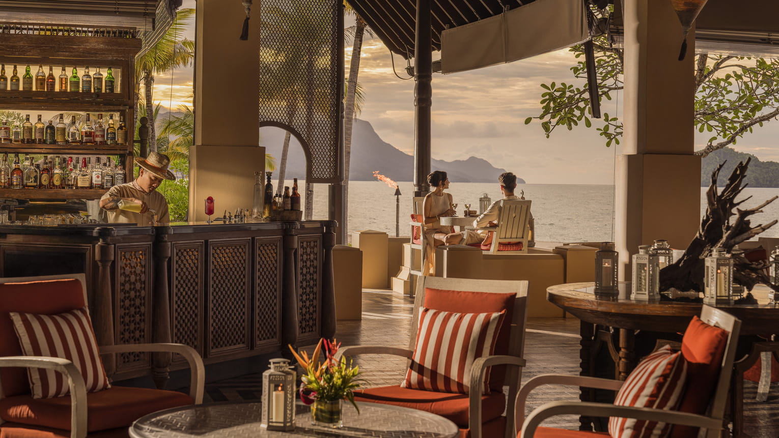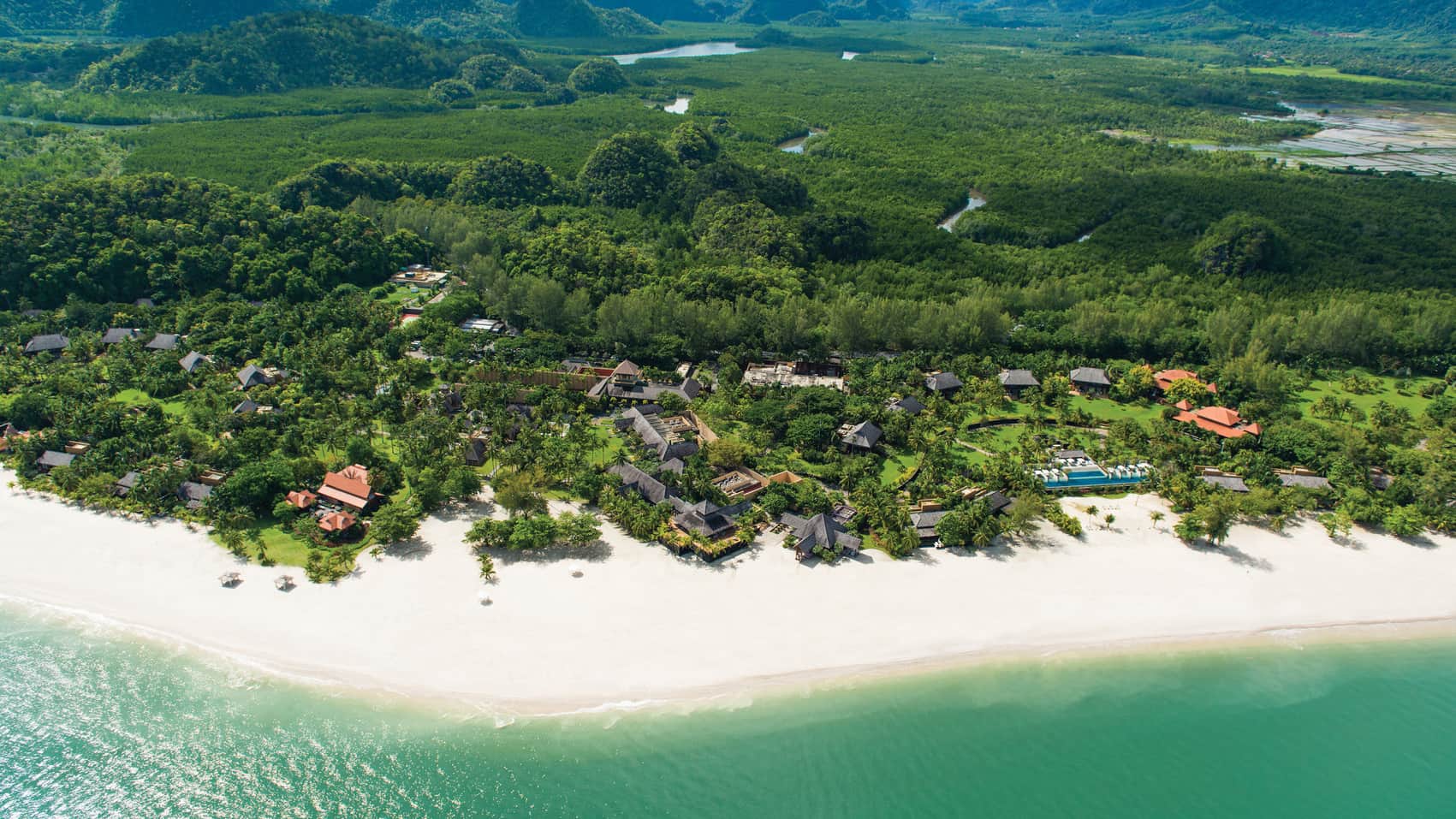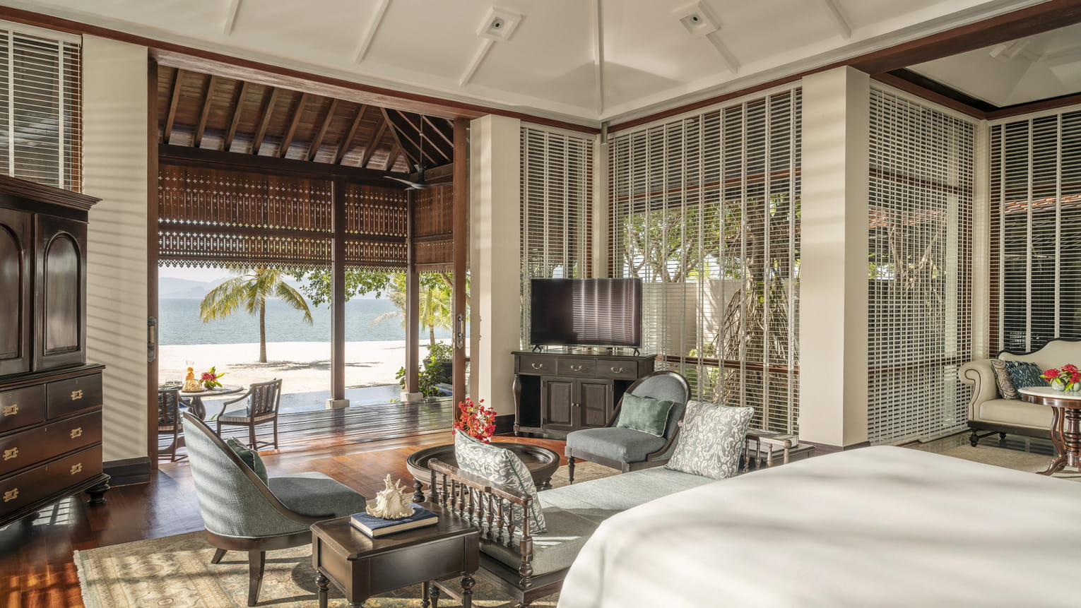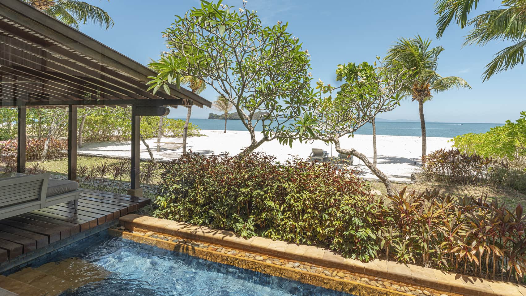 Пляжная вилла c 2-мя спальнями: в главной спальне – двуспальная кровать, собственная ванная комната с ванной, душевой кабиной, гардеробной и тропический душ на открытом воздухе; в гостевой спальне – двуспальная кровать, гостевая ванная комнат с душевой кабиной, гостиная с обеденной зоной на 6 персон, меблированная терраса с обеденной зоной на 6 персон, частный бассейн (12 м²), сад, шезлонги, пляжный гамак, выход на пляж, вид на море; привилегии для гостей*, план номера;