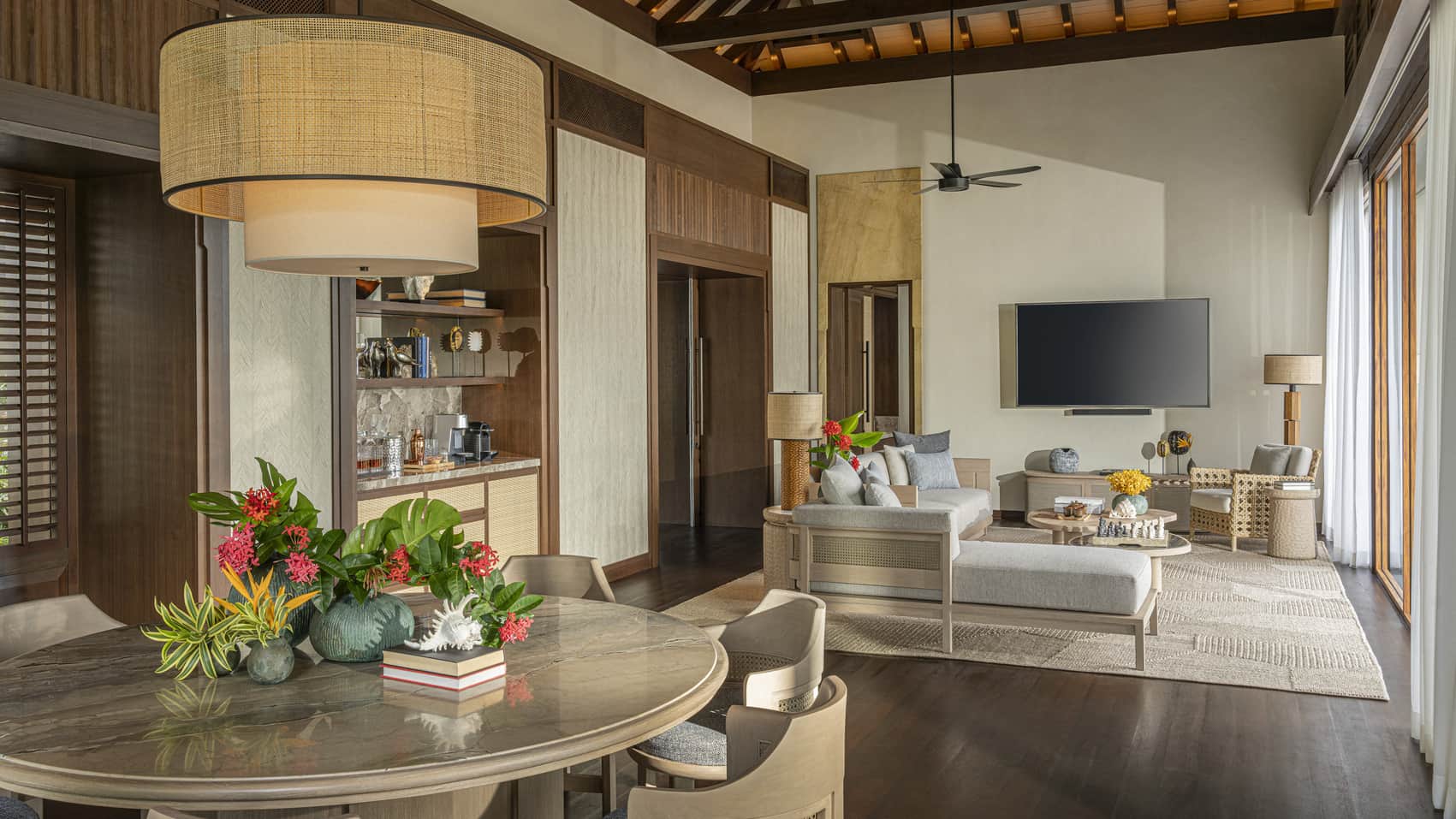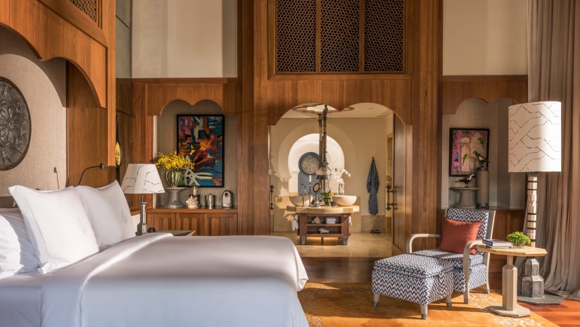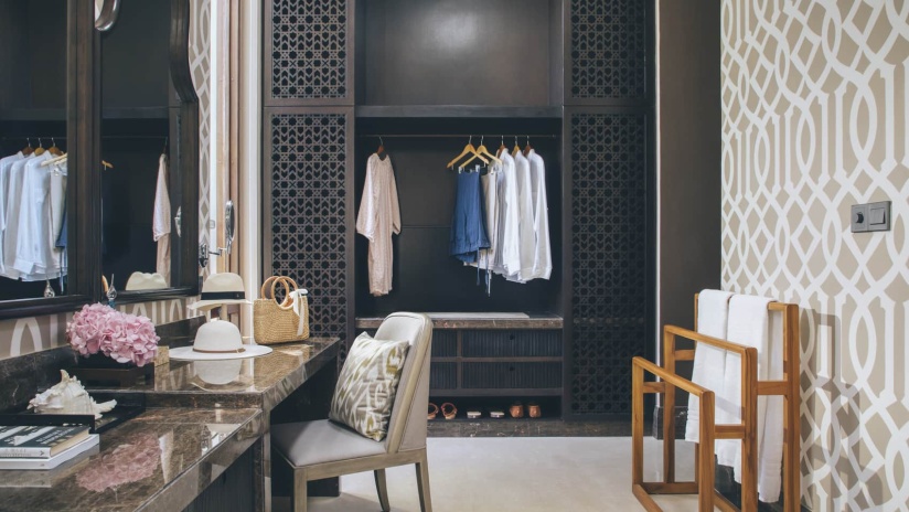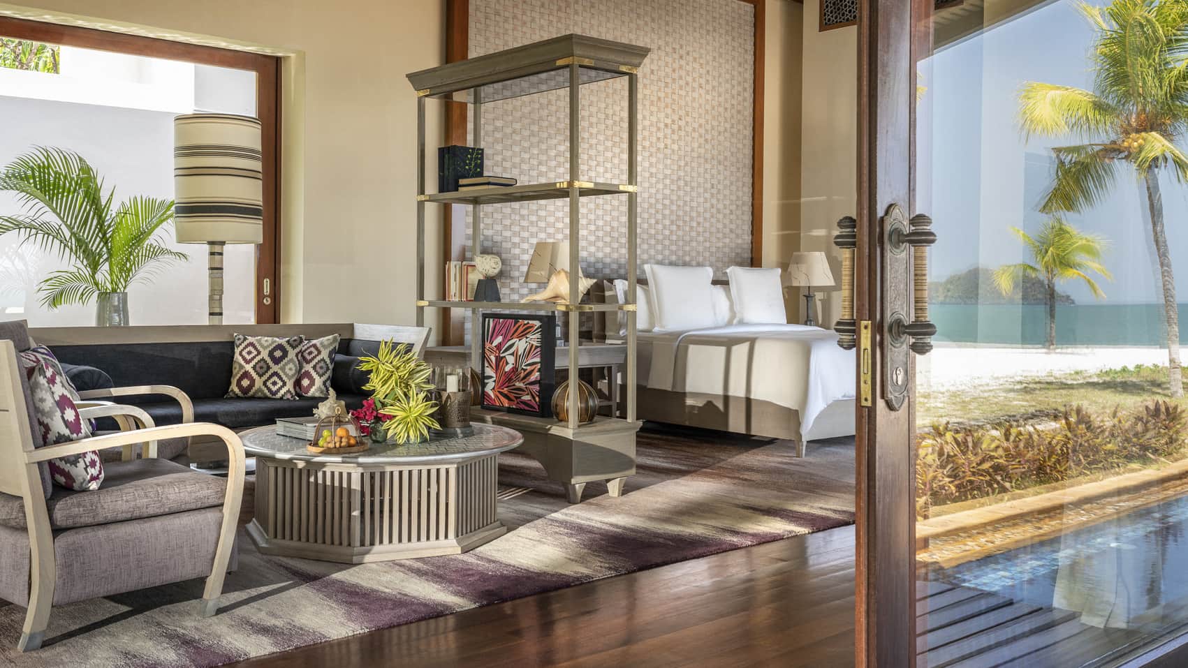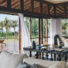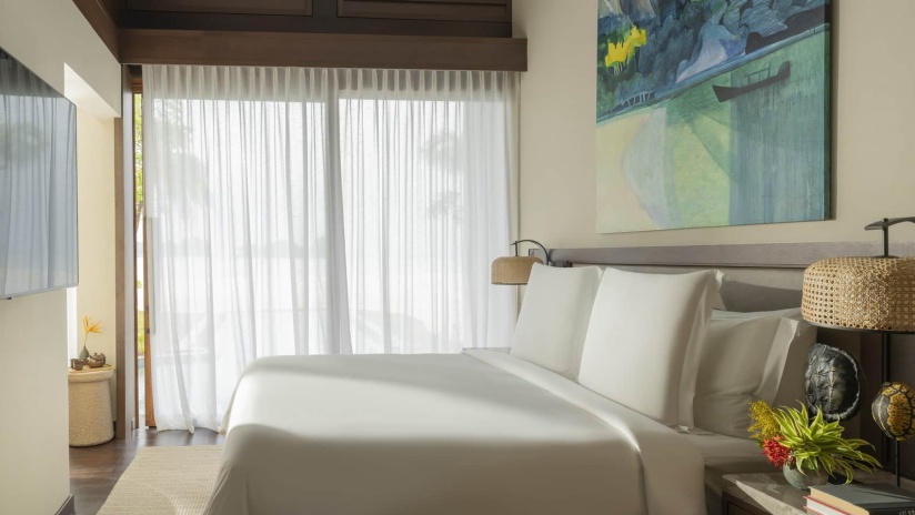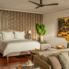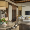 Пляжная вилла: спальня с двуспальной кроватью, ванная комната с ванной, душевой кабиной, гардеробной и тропическим душем на открытом воздухе, гостиная зона отделена стеллажной перегородкой, есть отдельный TV–лаунж, отдельный кабинет, меблированная терраса с обеденной зоной на 4 персоны, шезлонги, пляжный гамак, частный бассейн (14 м²), сад, выход на пляж, вид на пруды, море и пляж; привилегии для гостей*, план номера;