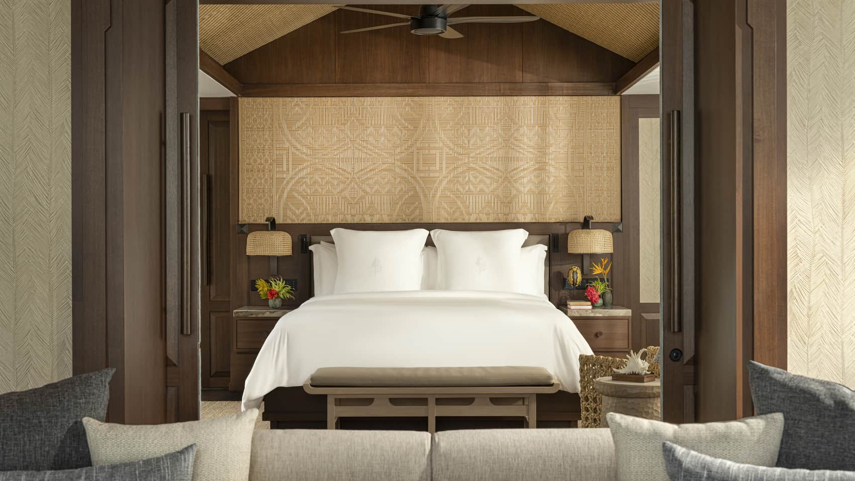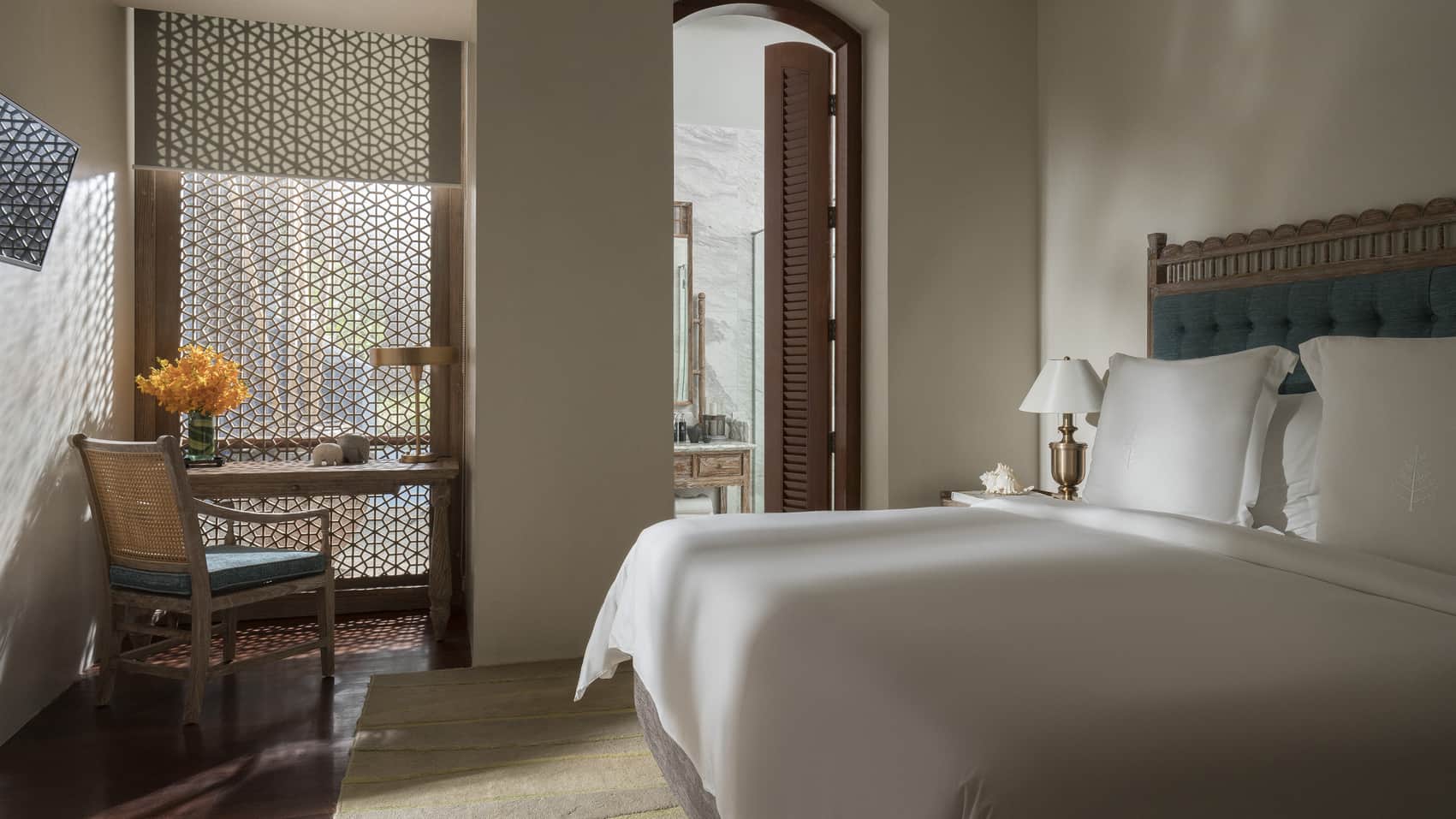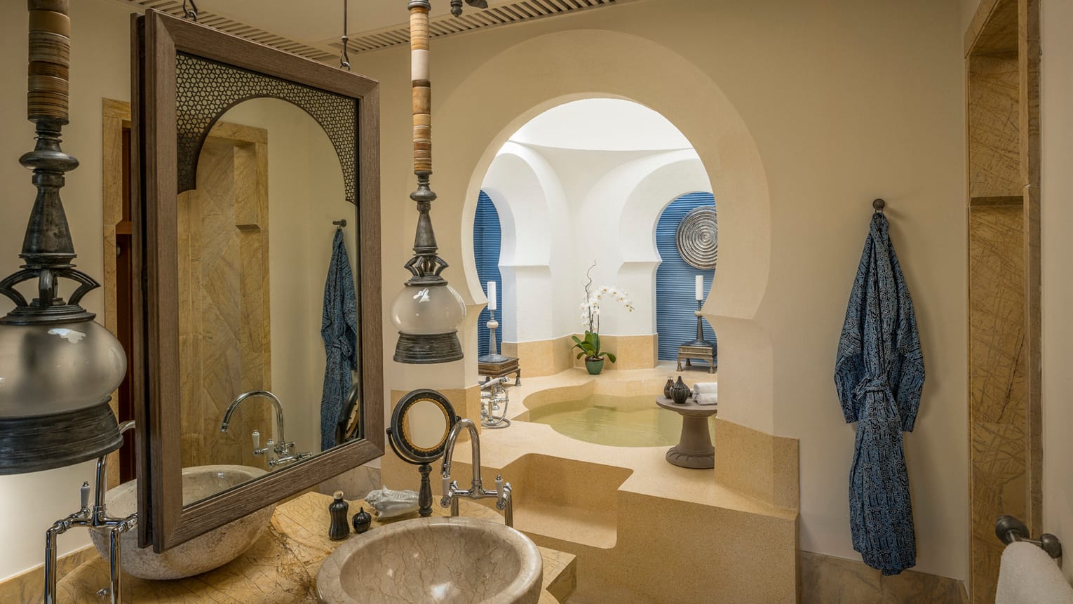 Пляжная вилла: спальня с двуспальной кроватью, ванная комната с ванной, душевой кабиной, гардеробной и тропическим душем на открытом воздухе, гостиная зона отделена стеллажной перегородкой, есть отдельный TV–лаунж, отдельный кабинет, меблированная терраса с обеденной зоной на 4 персоны, шезлонги, пляжный гамак, частный бассейн (14 м²), сад, выход на пляж, вид на пруды, море и пляж; привилегии для гостей*, план номера;