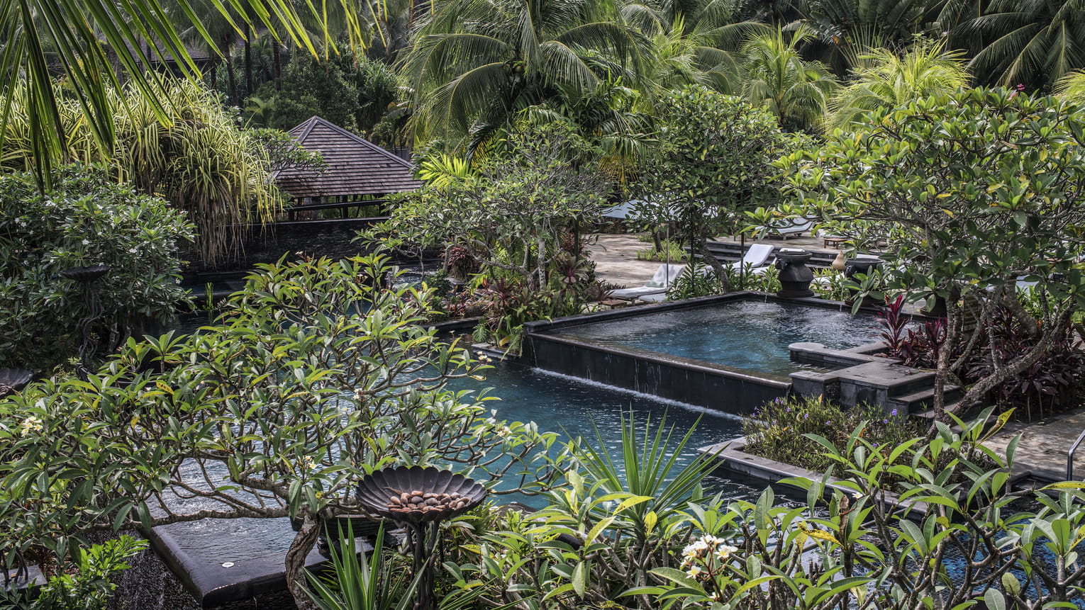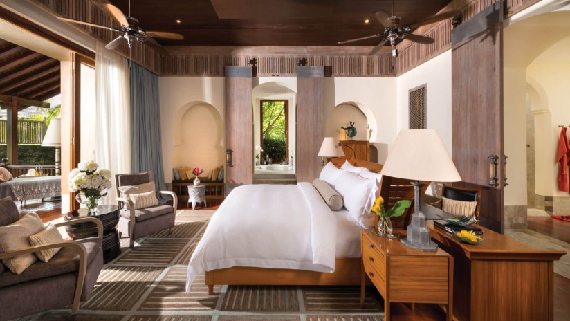 Вилла c 3-мя спальнями в южной части курорта: 2 спальни с двуспальными кроватями, каждая с собственной ванной комнатой с ванной и душевой кабиной, ванной-джакузи и душем на открытом воздухе; 1 спальня с двумя односпальными кроватями и собственной ванной комнатой с душевой кабиной, просторная гостиная с зоной отдыха и обеденной зоной на 8 персон, гардеробная/ кладовая, выход на меблированную террасу-патио с обеденным столом и зонами отдыха с кушетками и шезлонгами, частный бассейн (22 м²), сад, вид на сад; привилегии для гостей*, план номера;