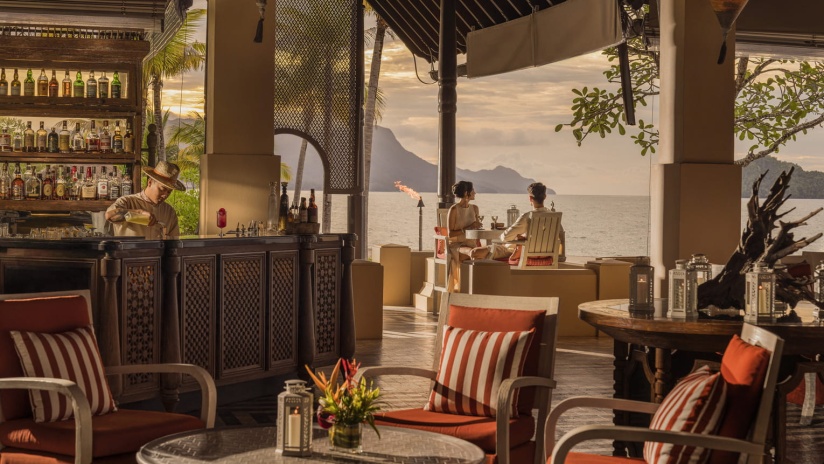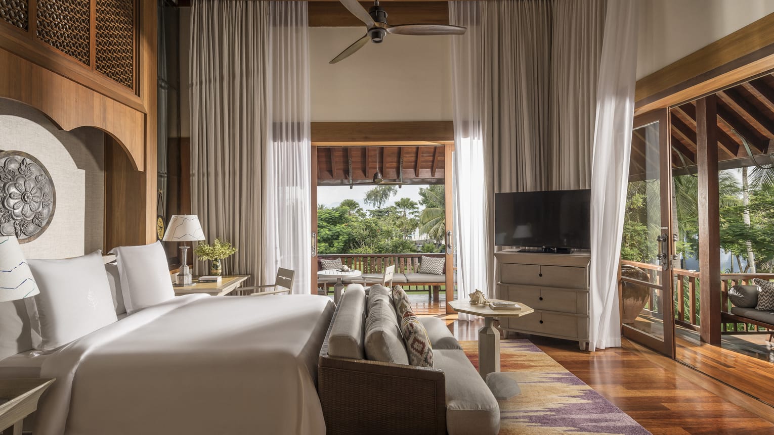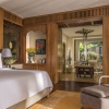 Королевская вилла из двух раздельных павильонов: в одном – спальня с двуспальной кроватью, кушеткой, обеденным столом и просторной ванной комнатой с ванной, душевой кабиной, гардеробной и тропический душ на открытом воздухе, выход из спальни на собственную меблированную террасу с обеденной зоной, шезлонгами и беседкой: в другом павильоне – гостиная с зоной отдыха, обеденным столом на 6 персон, барная стойка, подсобные помещения, гостевой туалет, выход на вторую меблированную террасу с обеденной зоной на 6 персон, кушеткой, шезлонгами, беседкой и бассейном-инфинити, сад, пляжный гамак, выход на пляж; вид на море, на скалы и лес, привилегии для гостей*, план номера;