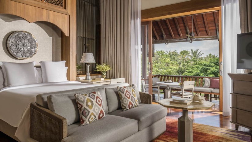 Номер на верхнем этаже: 1 двуспальная кровать, кушетка, гостевой уголок, ванная комната с душем, ванна и душ на открытом воздухе, меблированный балкон с обеденной зоной и кушеткой, вид на ландшафтный сад, план номера;